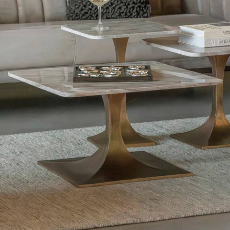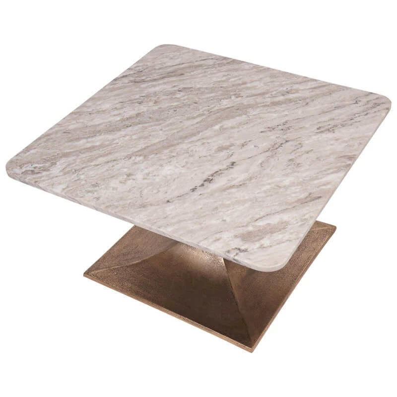 A contemporary 70cm square marble coffee table featuring an aluminium base with an antique brass effect finish that adds a rustic charm. The white marble top features natural veining that characterises the table. With soft rounded edges on the table top, it leans towards a sleek, contemporary feel.