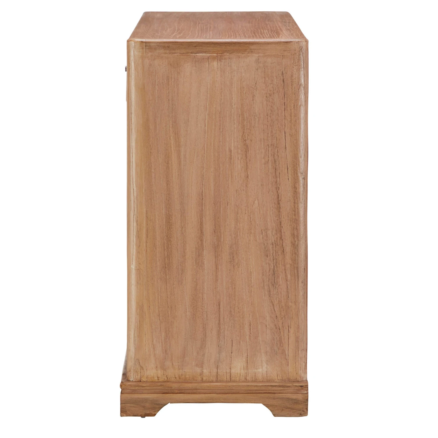 Anchored by large rectangular base, the table balances delicate aesthetics with robust integrity. The soft, neutral palette of the solid elm wood allows it to seamlessly integrate into diverse interior landscapes, while its vintage-inspired design elements whisper of timeless craftsmanship. Soft, muted tones highlight the table’s sophisticated lines and textural nuances.