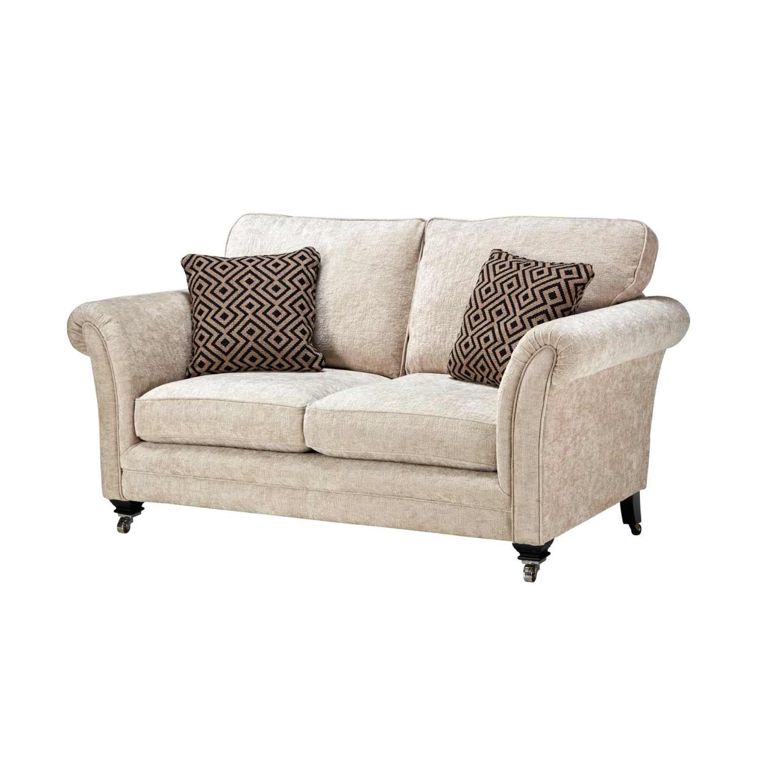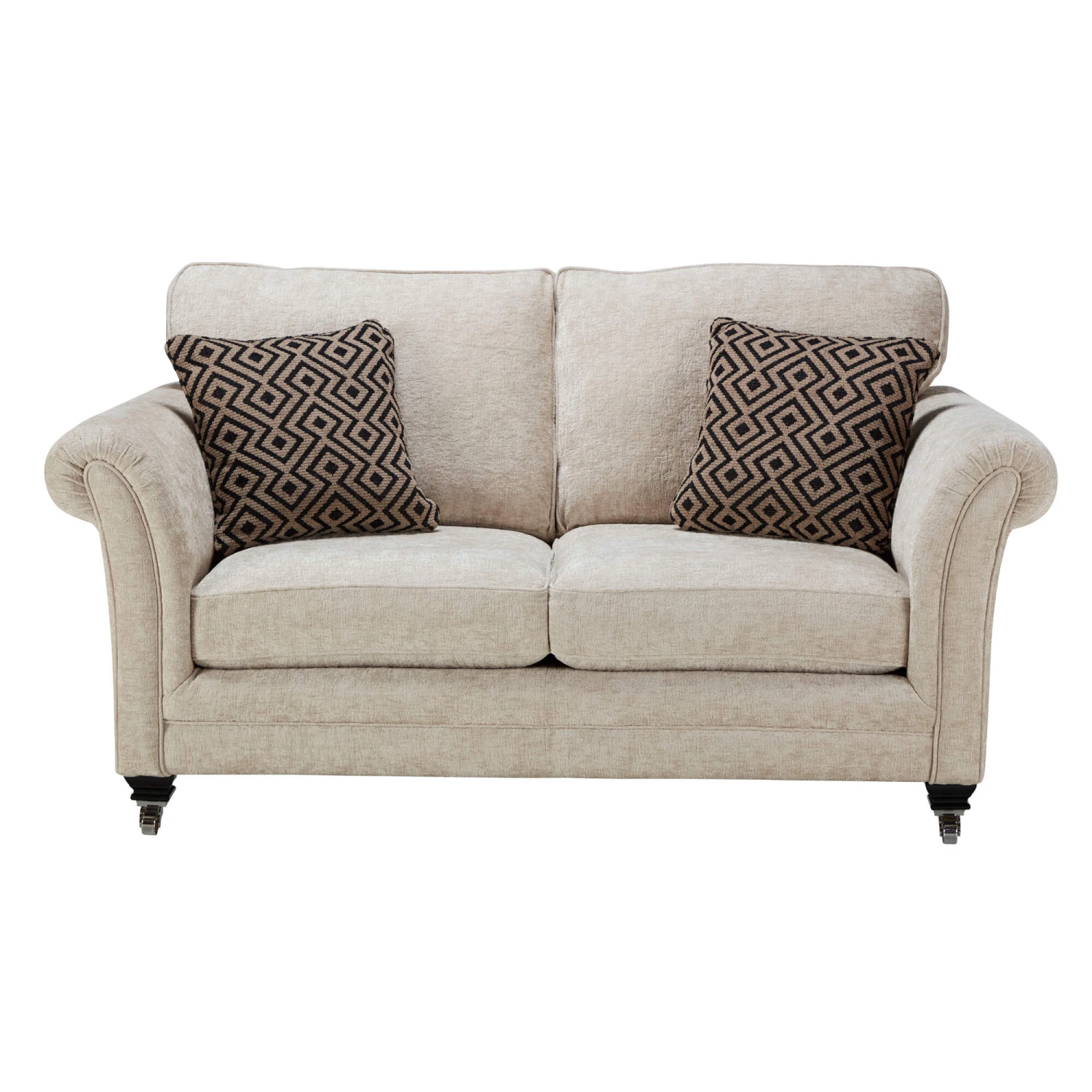 The main body of the sofa is upholstered in a natural beige chenille fabric for an elegant focal feature; whilst the two scatter cushions included are upholstered in a geometric natural and black patterned fabric, to create a dynamic design that is an extravagant visual treat to the eyes. Accompanied with its cold cure seat interior, which conforms to the shape of your body for a superiorly comfortable and supportive seating experience, the Lucinda Sofa is as indulgent as it looks and is sure to make a stylish centre-piece in any home, with its commanding presence.