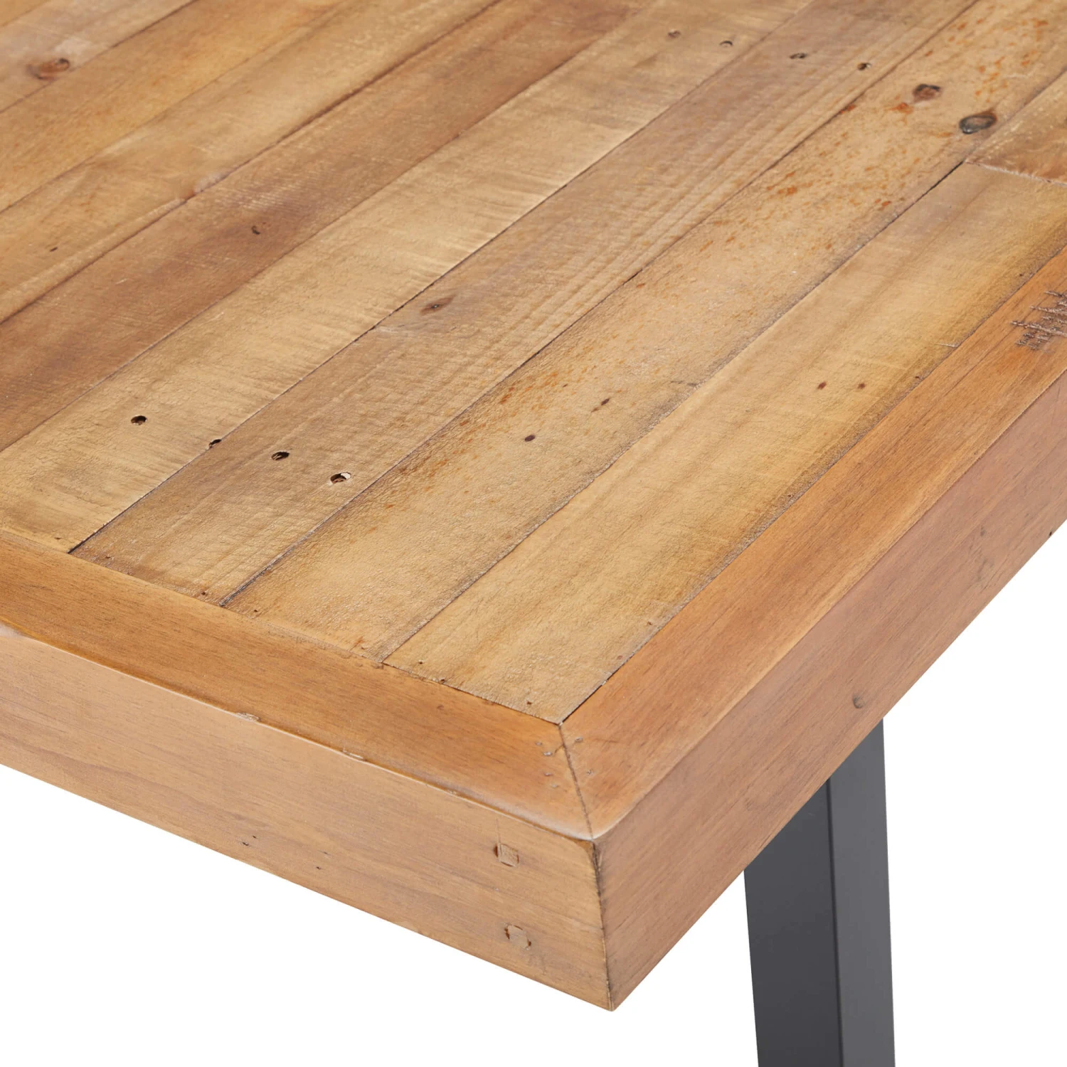 Made from reclaimed materials the wooden table top is topped off with a water based sealer and a contrasting black u shaped base.