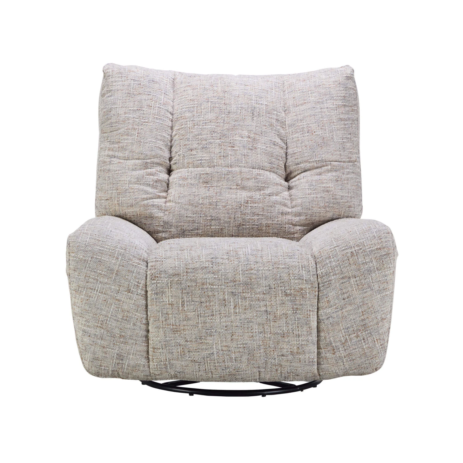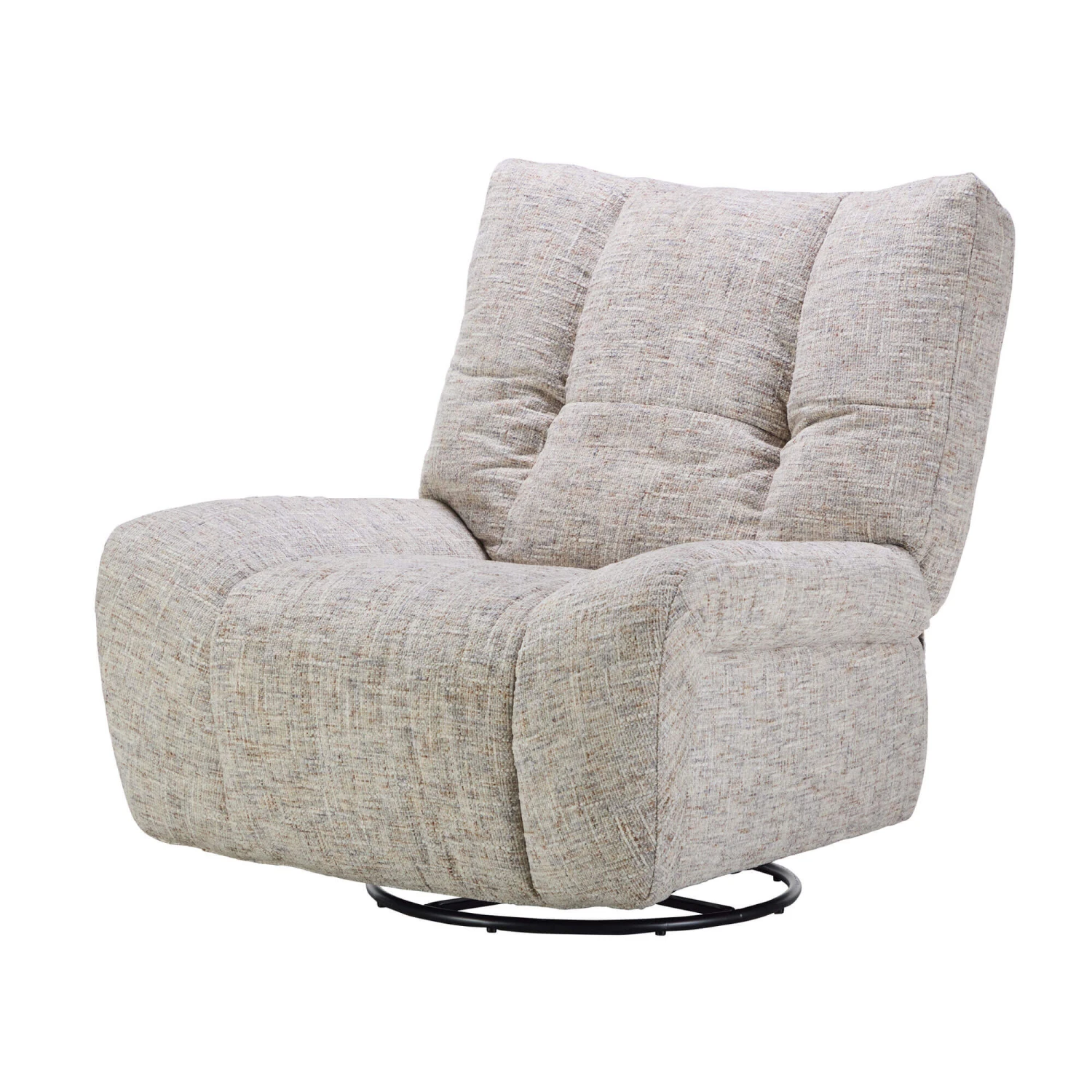 The Marco Greige Fabric Power Glider Recliner Chair is built with both comfort and functionality in mind. Upholstered in a greige fabric, the Marco features a graceful silhouette, two deep value detailing and a round black metal swivel base, creating a distinctive yet inviting look.