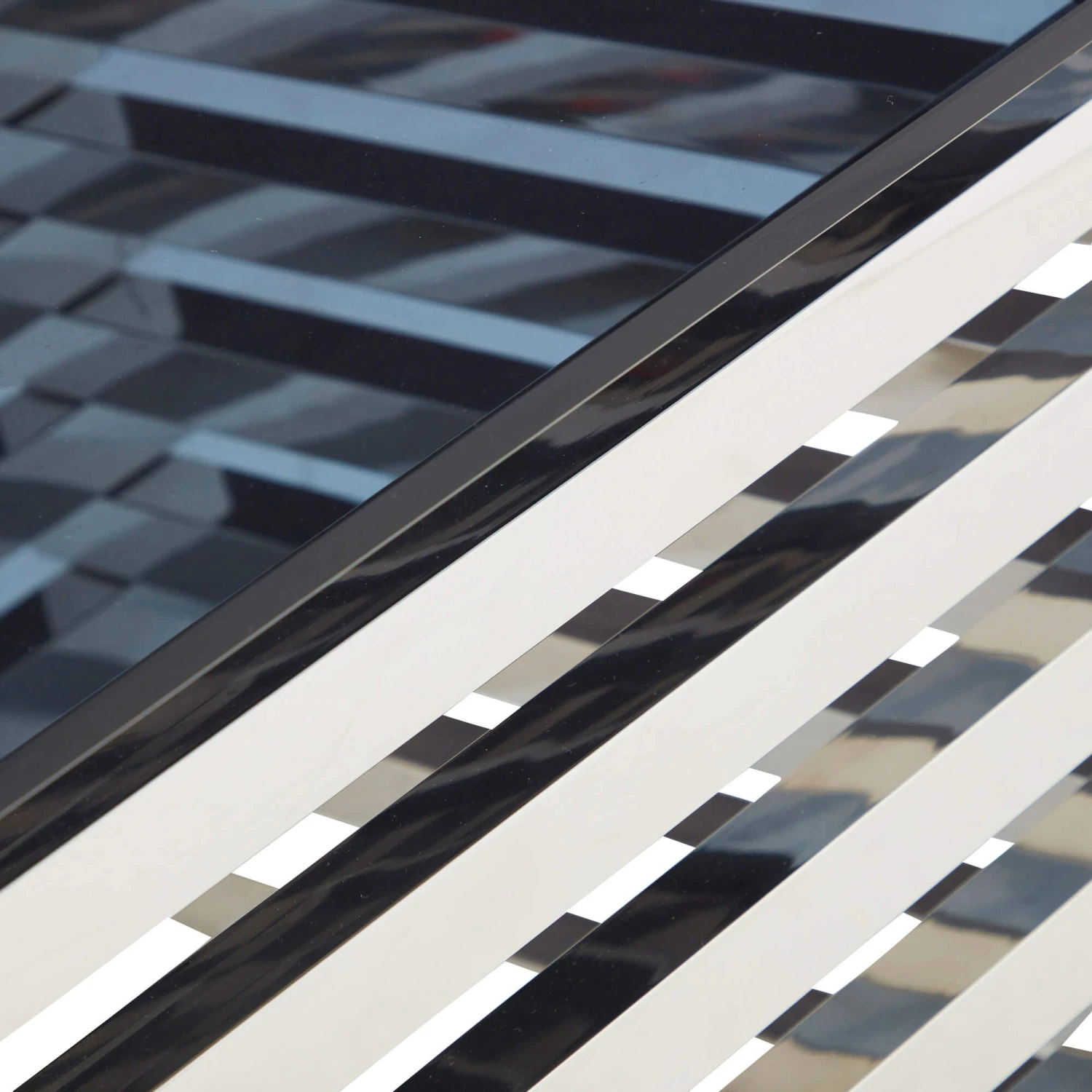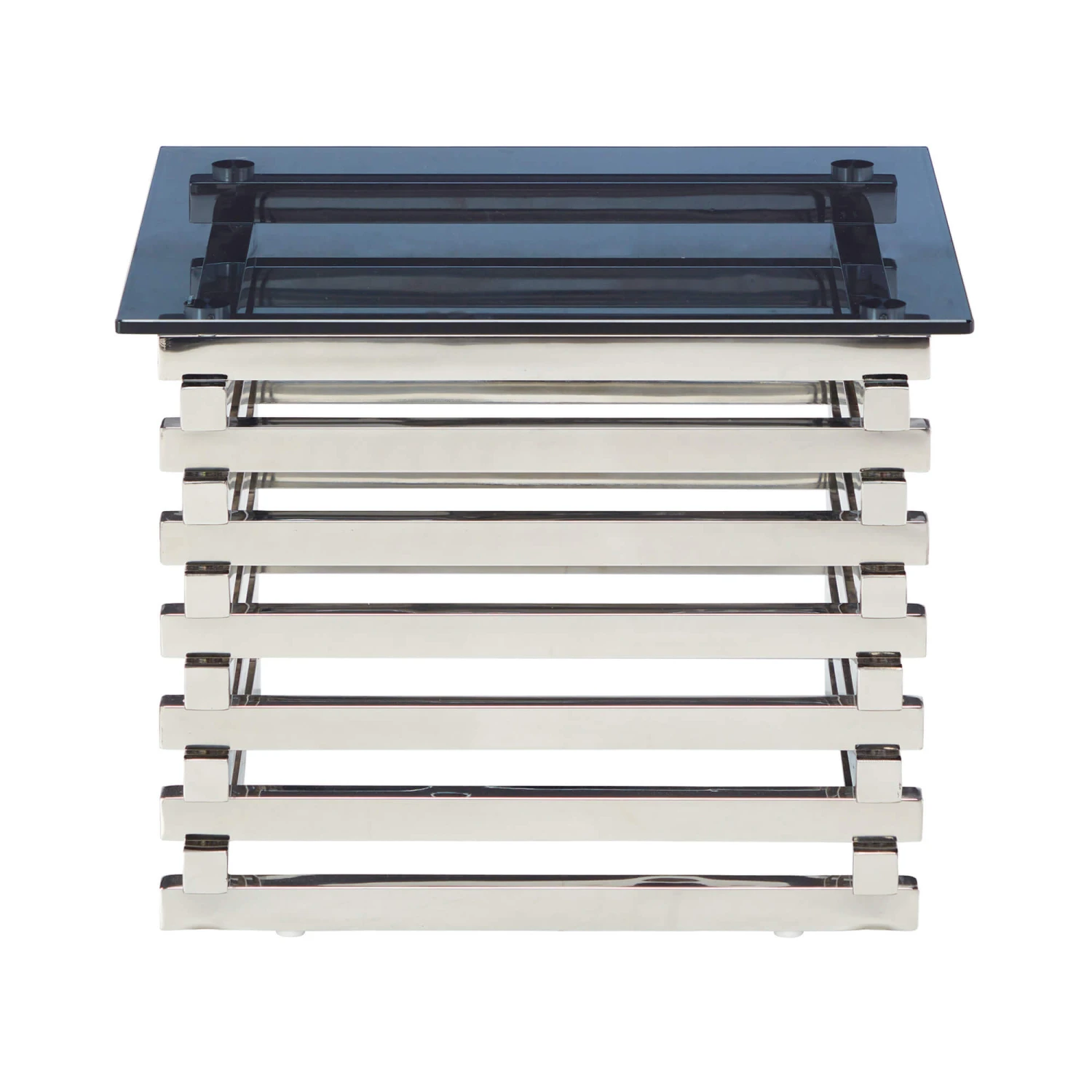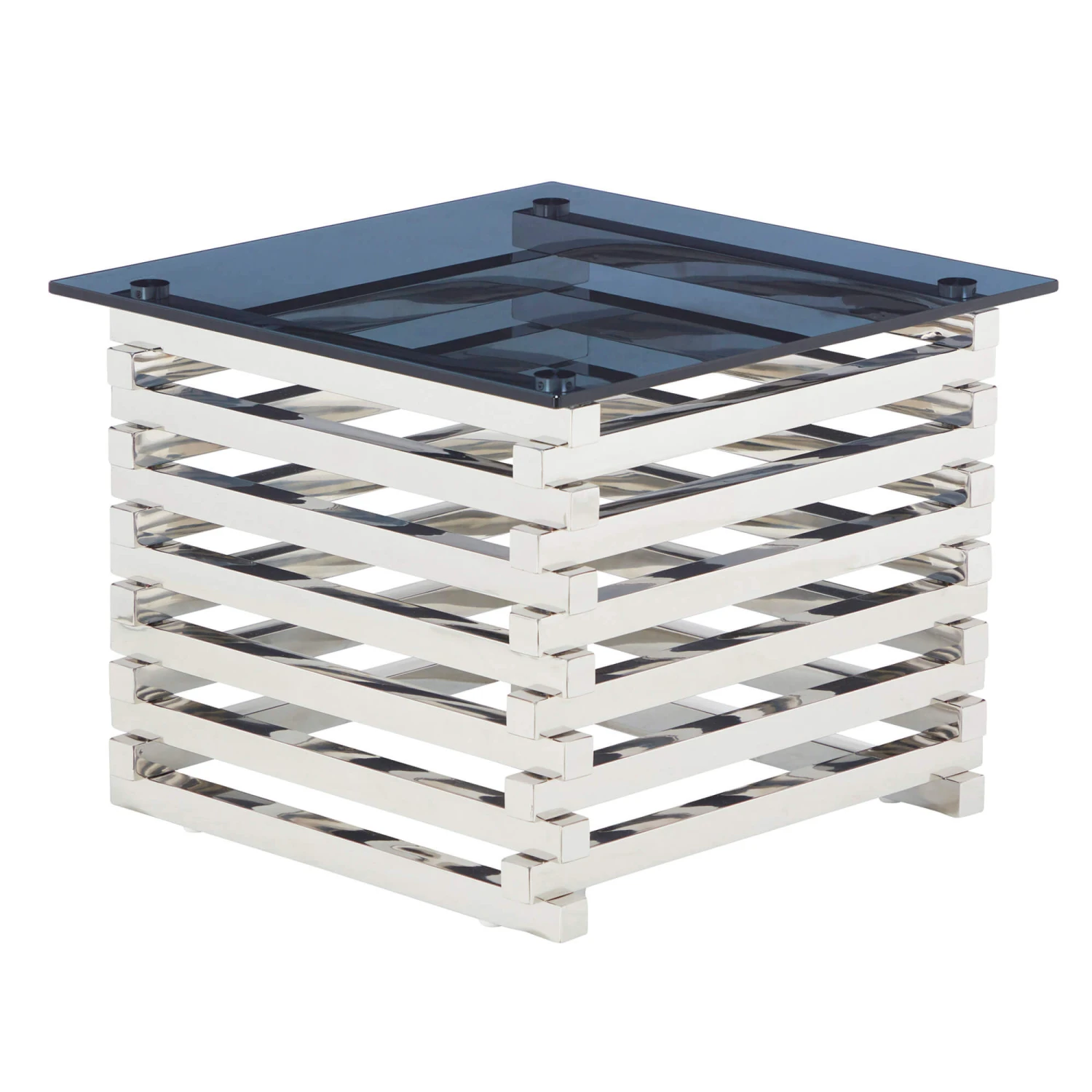 Create a statement look in your living area with this stunning end table. The Metz collection has a distinctly modern design with polished stainless steel bars and an elegant tinted glass top. The uniqueness of this table, with its striking construction and elegant finish, is sure to add an air of contemporary grandeur to your home.