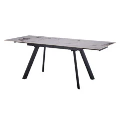 A sintered stone extending dining table that features a marble effect sintered stone top with dark veins that mimic natural marble. The table’s sleek, thin profile and elegantly splayed black powder-coated legs create a contemporary silhouette. The tables compact extension mechanism allows each end to extend upwards, providing extra surface, ideal when hosting dinner parties or family gatherings. The minimalist aesthetic of the table makes it ideal for contemporary spaces.