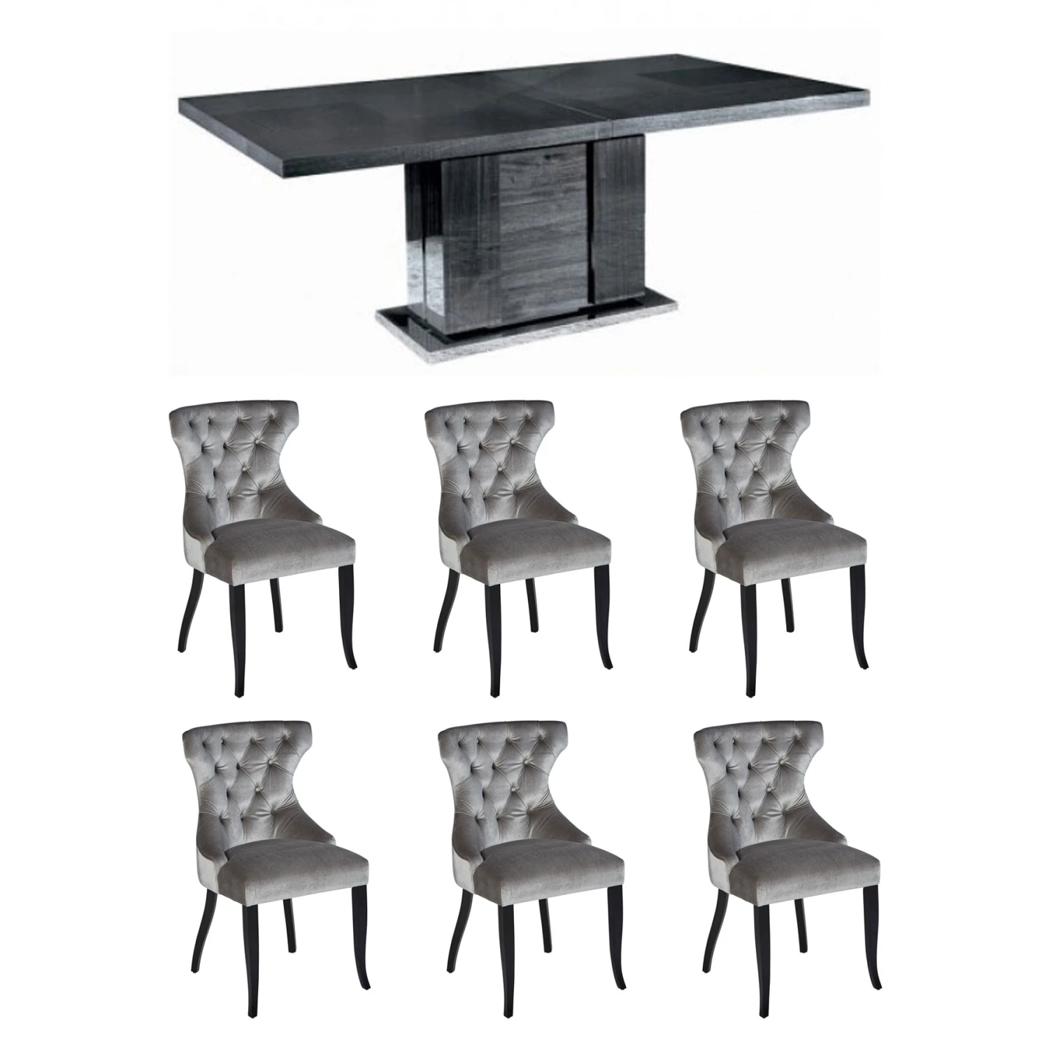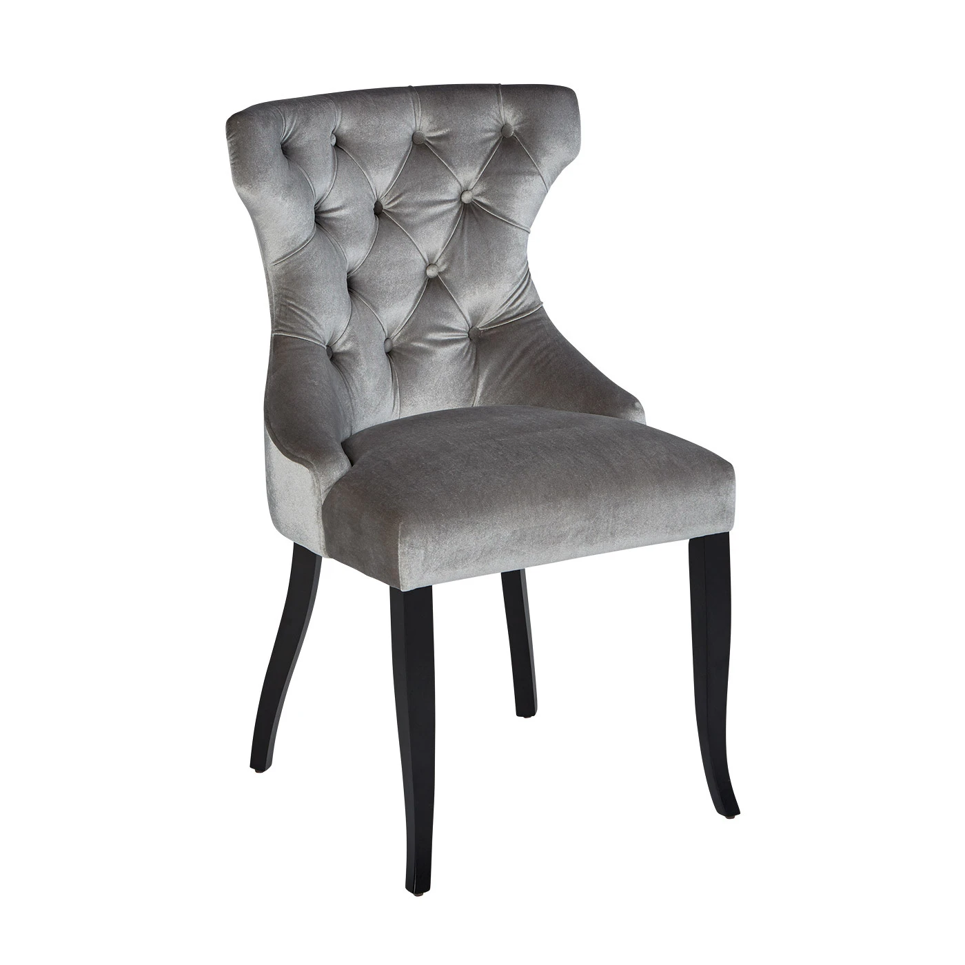 The Gaudi Dining chair has a deep valueed back with accentuating curves. Upholstered in a wonderful soft, silver velvet and fitted with complimenting matte black legs, this chair is the image of opulence.