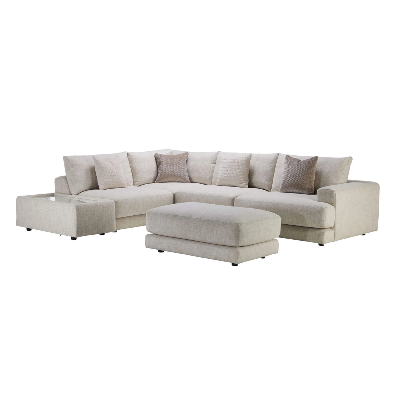 The Naxos Large Tyne Natural Fabric Open End Right Arm Corner Group With Rectangular Table & Footstool will elevate every home with its understated presence. Upholstered in a natural fabric, the Naxos features clean lines, wide armrests, deep cushioning and sits on top of unseen glides, ensuring superior comfort and stability.