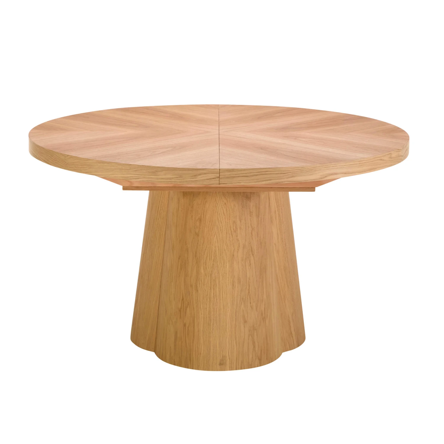 The Nimbus Round 130cm Natural Oak Extending Dining Table is a stunning centerpiece featuring a starburst-patterned top with a beautifully mirrored wood grain running down the middle. The table has a thick, flat-edged surface supported by three subtle cone-shaped legs, each angled gracefully towards a central point, lending the piece both stability and an elegant silhouette. A distinctive chevron detail points towards the centre of the table, adding a refined touch to its natural oak finish.