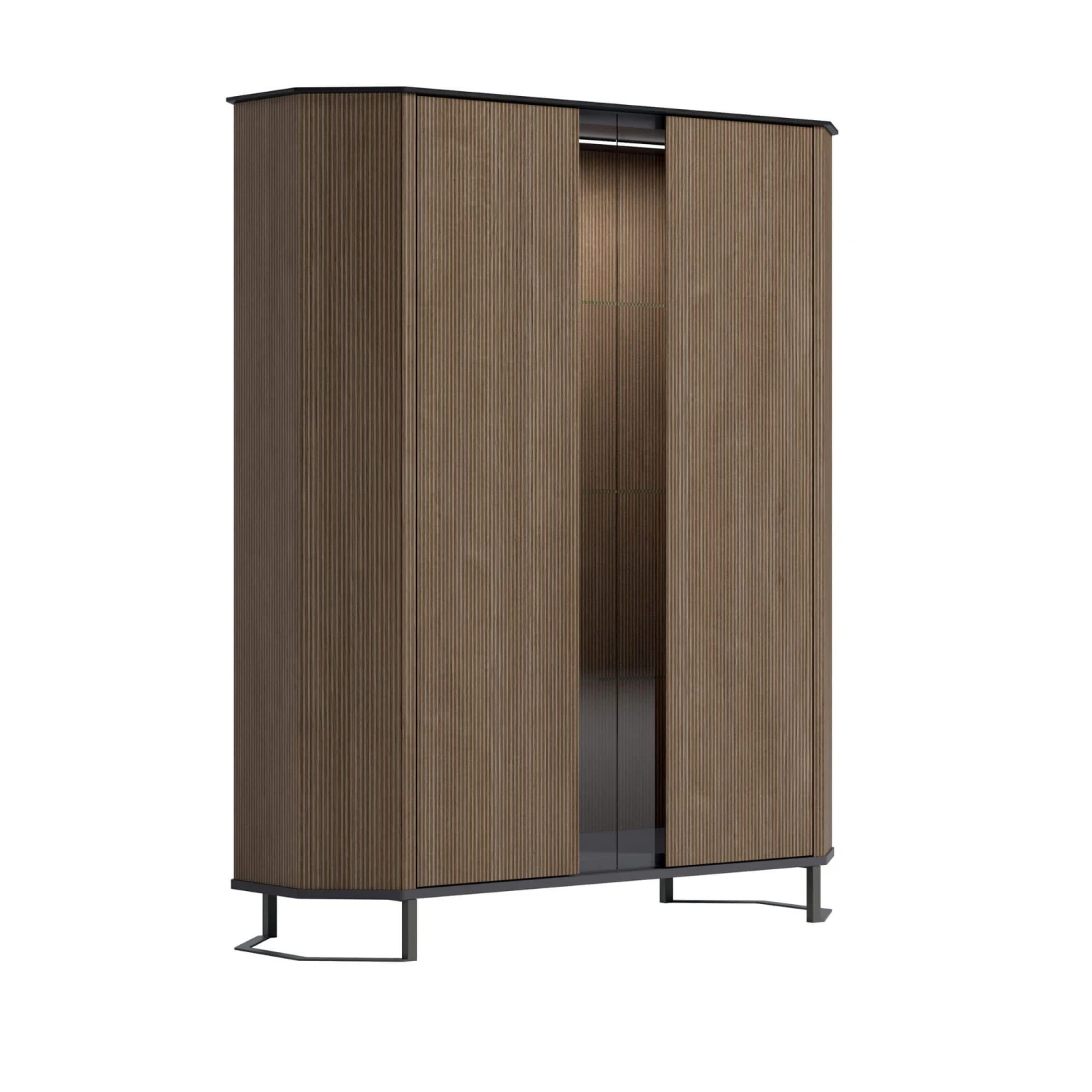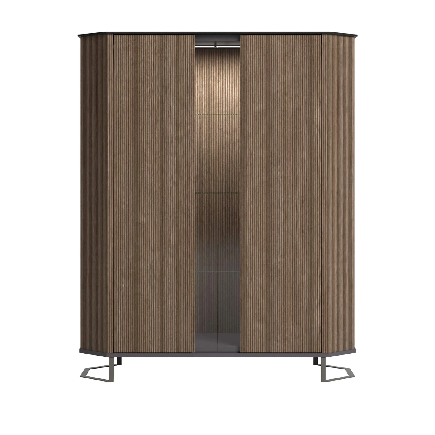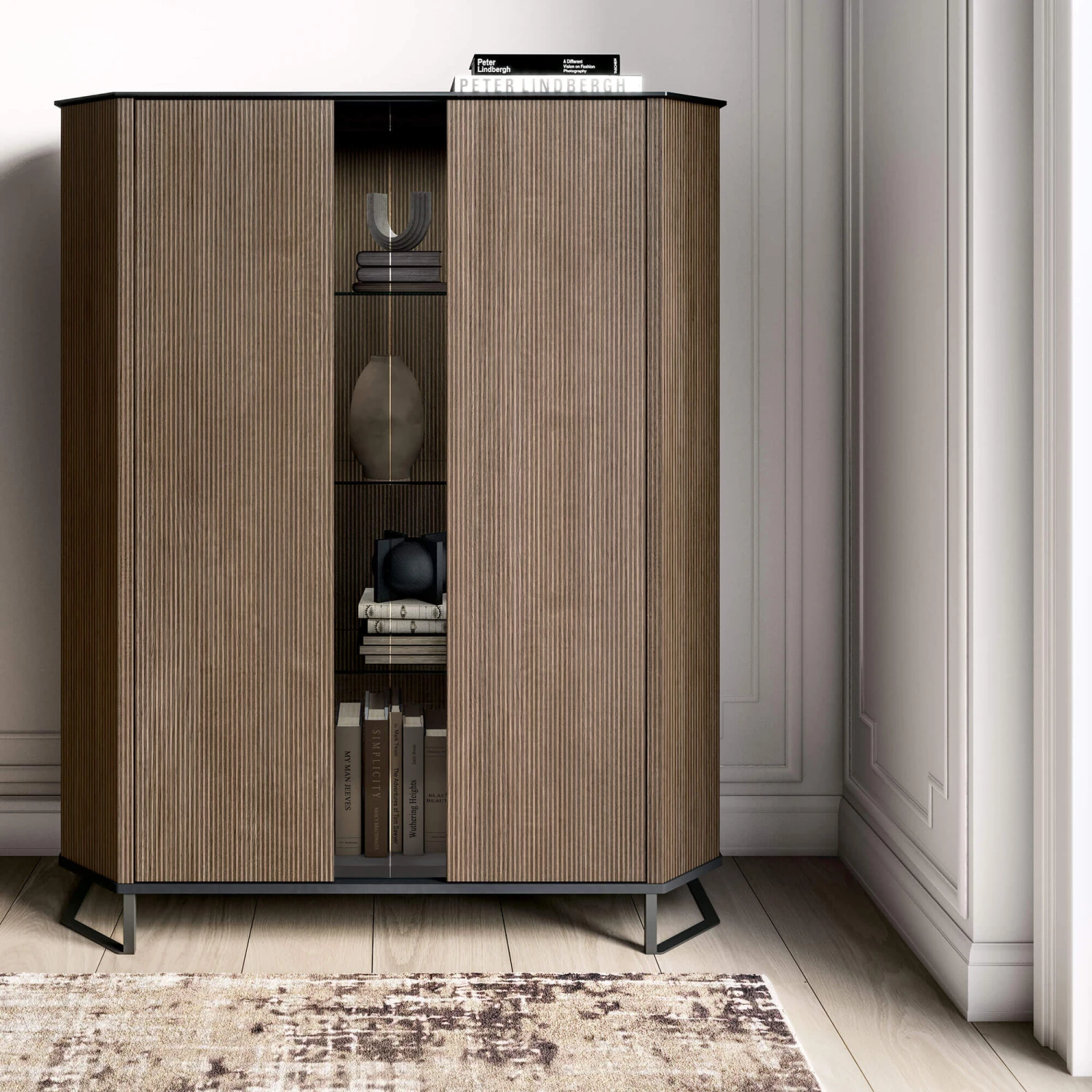 Channelling a modern influence, the tall 2 door cabinet boasts clean lines and a rectangular silhouette for a touch of contemporary flair. The unit’s hexagon edges are mirrored on the base to create a firm base that provides the unit with stability whilst complimenting the dark brown ribbed wood, which resembles a honey dipper. On the top of the unit is a laminate coating with a wonderful marble effect which displays elements of gold, giving the unit and your spaces a modern and luxurious feel.