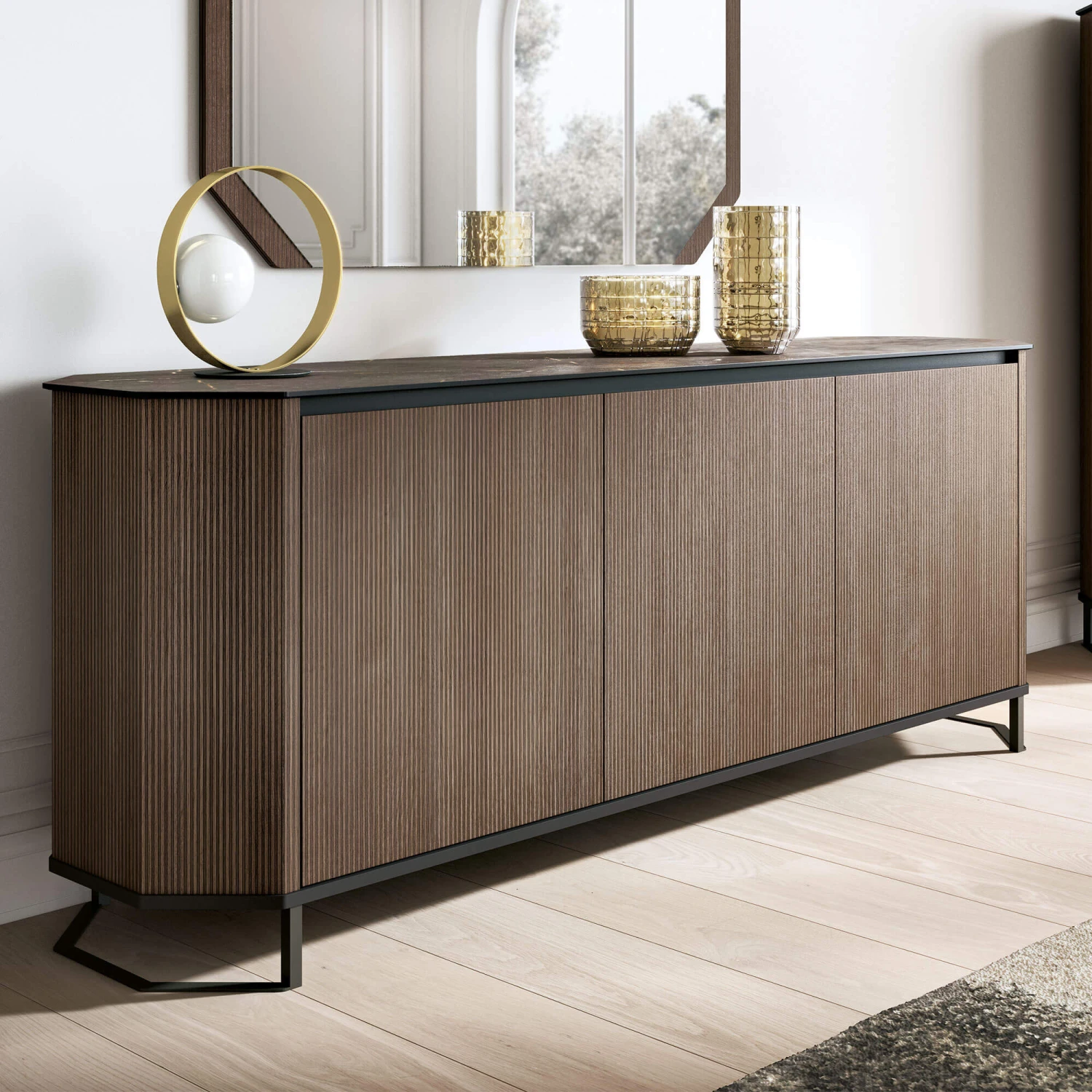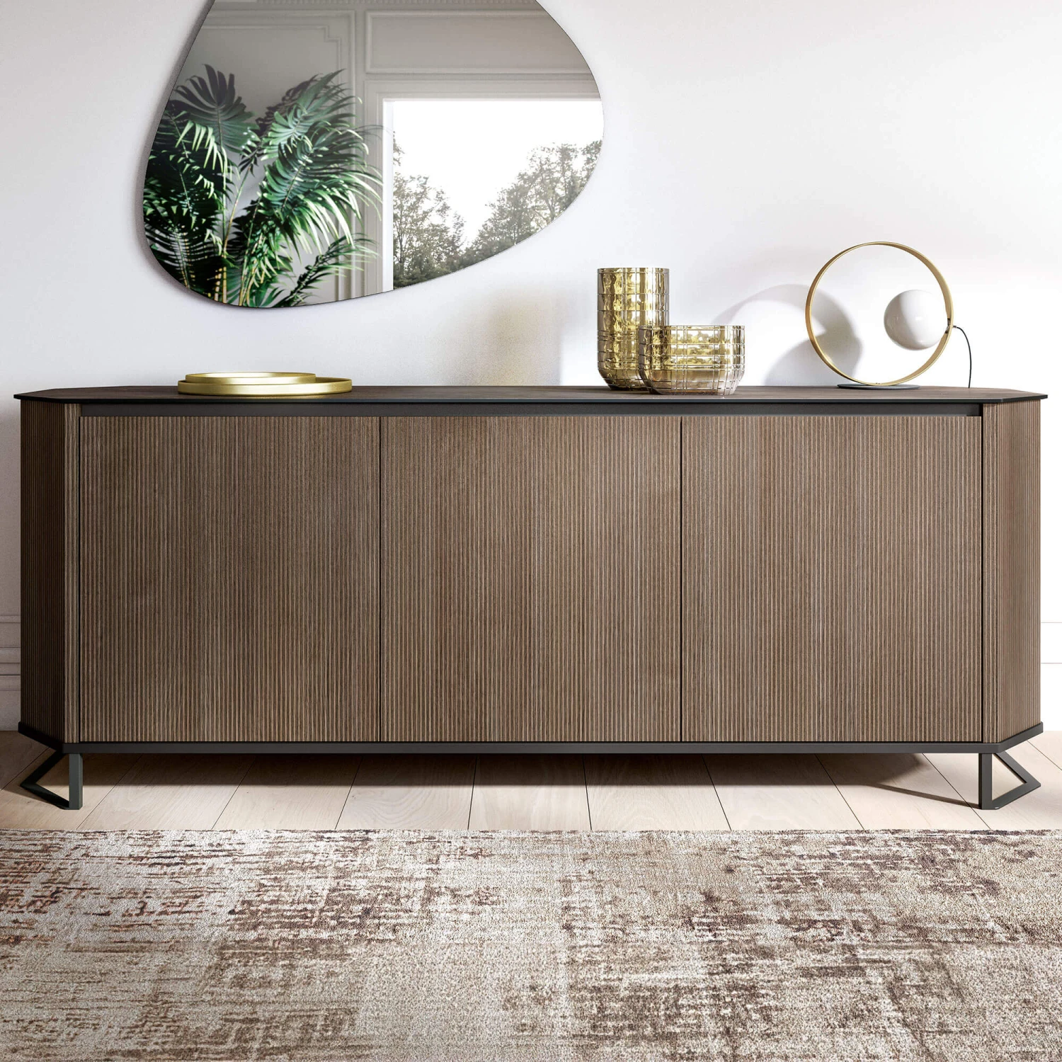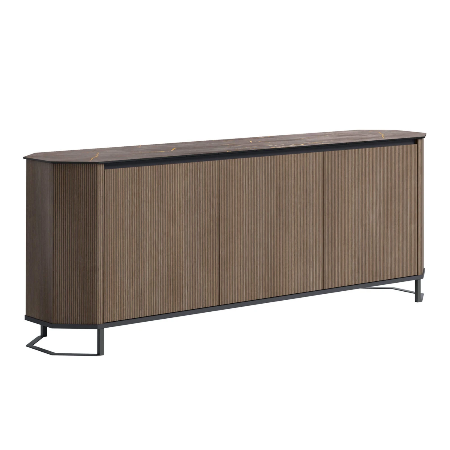 Channelling a modern influence, the 3 door sideboard boasts clean lines and a rectangular silhouette for a touch of contemporary flair. The unit’s hexagon edges are mirrored on the base to create a firm foundation that provides the unit with stability whilst complimenting the dark brown ribbed wood, which resembles a honey dipper. On the top of the unit is a laminate coating with a wonderful marble effect which displays elements of gold, giving the unit and your spaces a modern and luxurious feel.