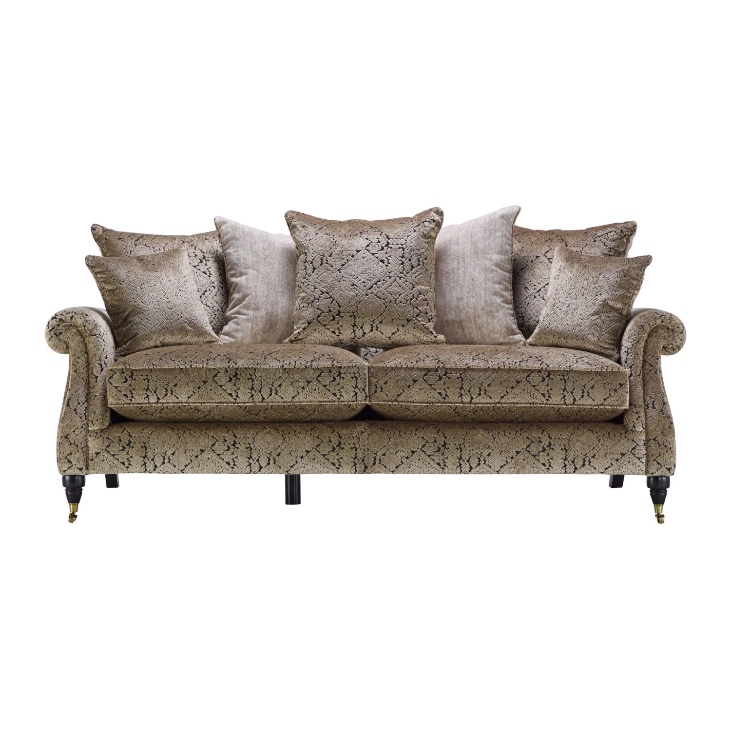 The Eastbury Mink Fabric Grand Pillow Back Sofa from Parker Knoll exudes timeless style. Upholstered in a Matira mink patterned fabric, the Eastbury features scroll arms, a pillow back design made up of five feather fibre mix cushions with a Sherpa oyster print reverse and mahogany wooden legs with brass metal castor feet, creating a luxurious and sophisticated piece.