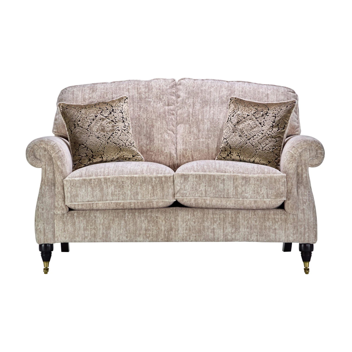 The Eastbury Oyster Fabric 2 Seater Formal Back Sofa from Parker Knoll exudes timeless style. Upholstered in a Sherpa Oyster fabric, the Eastbury features scroll arms and mahogany wooden legs with brass metal castor feet, creating a luxurious and sophisticated piece.