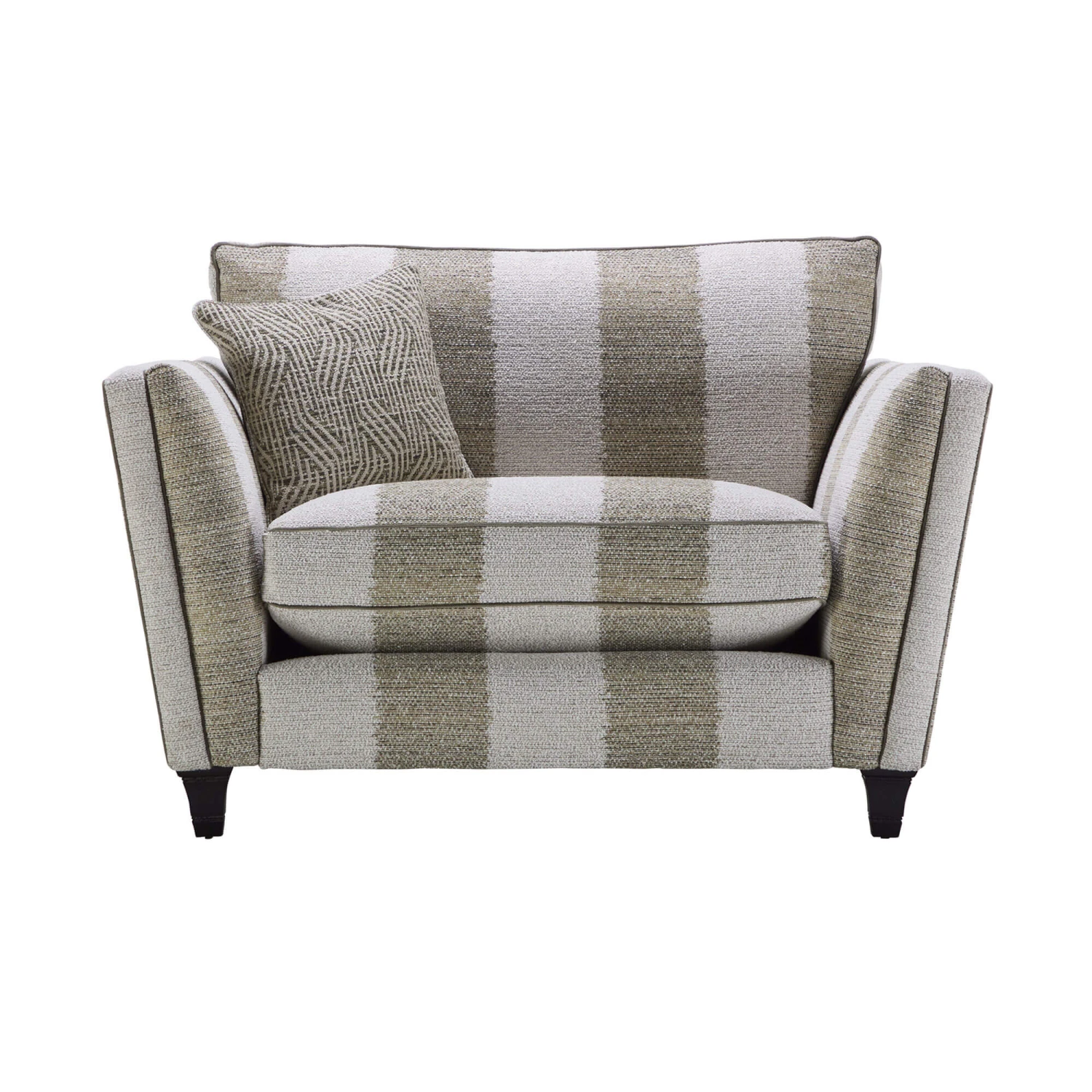 Sophistication meets unparalleled comfort with the Harlow Stripe Moss Green Fabric Snuggler Sofa from Parker Knoll. Upholstered in a Safi stripe moss green fabric, the Harlow features crisp lines, straight arms, tufted back seat cushions, tailored contrasting Miro moss green piping and mahogany wooden legs with brass metal castor feet, creating an inviting and lusciously sumptuous piece.