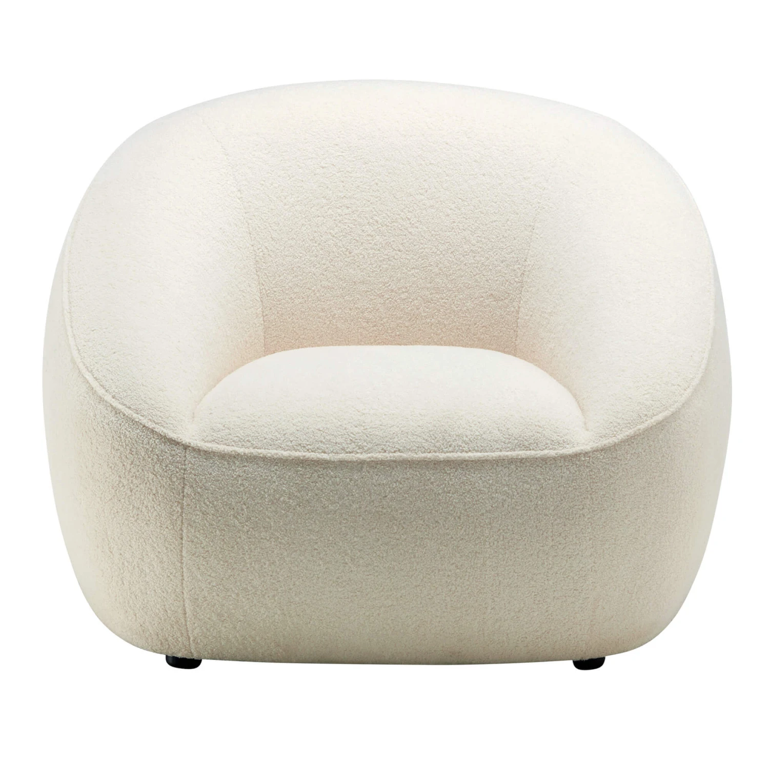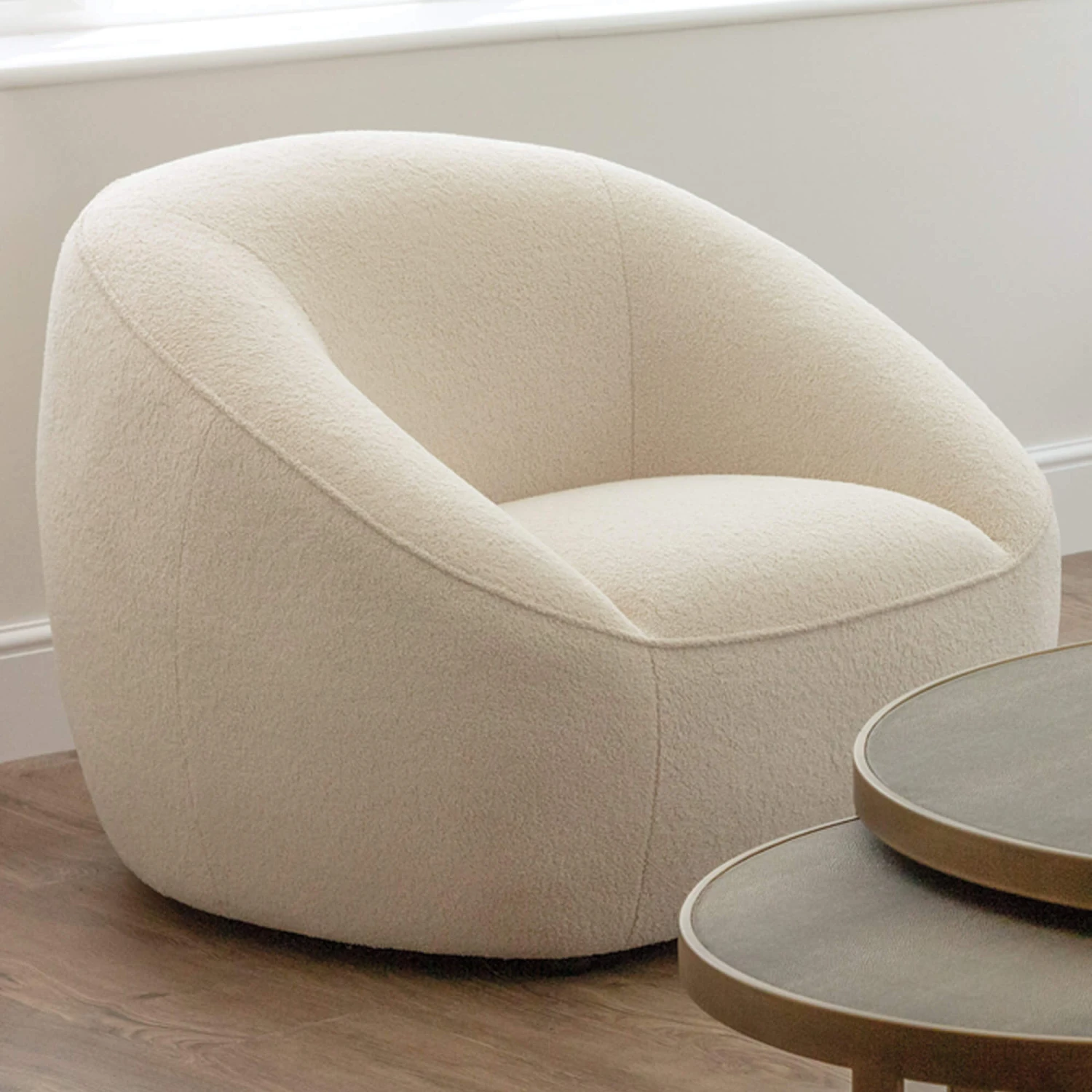 Snuggle up by the fireside with the Pebble Cream Teddy Bear Fabric Armchair. Offering an invitation to pure relaxation with its enveloping shape and cosy, sherpa-like, teddy bear fabric, the Pebble lures you in with its welcoming aura and homely features. A subtle panel effect creates a hint of visual interest and a pipe-effect trim enhances the crisp, flowing lines of the curved shape. Its curvaceous, mod-style silhouette makes a statement and ensures that this piece will stand proud in any setting; whilst a high resilient foam fills the seat interior to deliver a firm yet supportive seating experience. Accompanied with its low profile and refreshing, cream colour, the Pebble Armchair is well suited to a wide array of interiors and is sure to elevate the inviting atmosphere of any home, with its warm presence and endearing character.