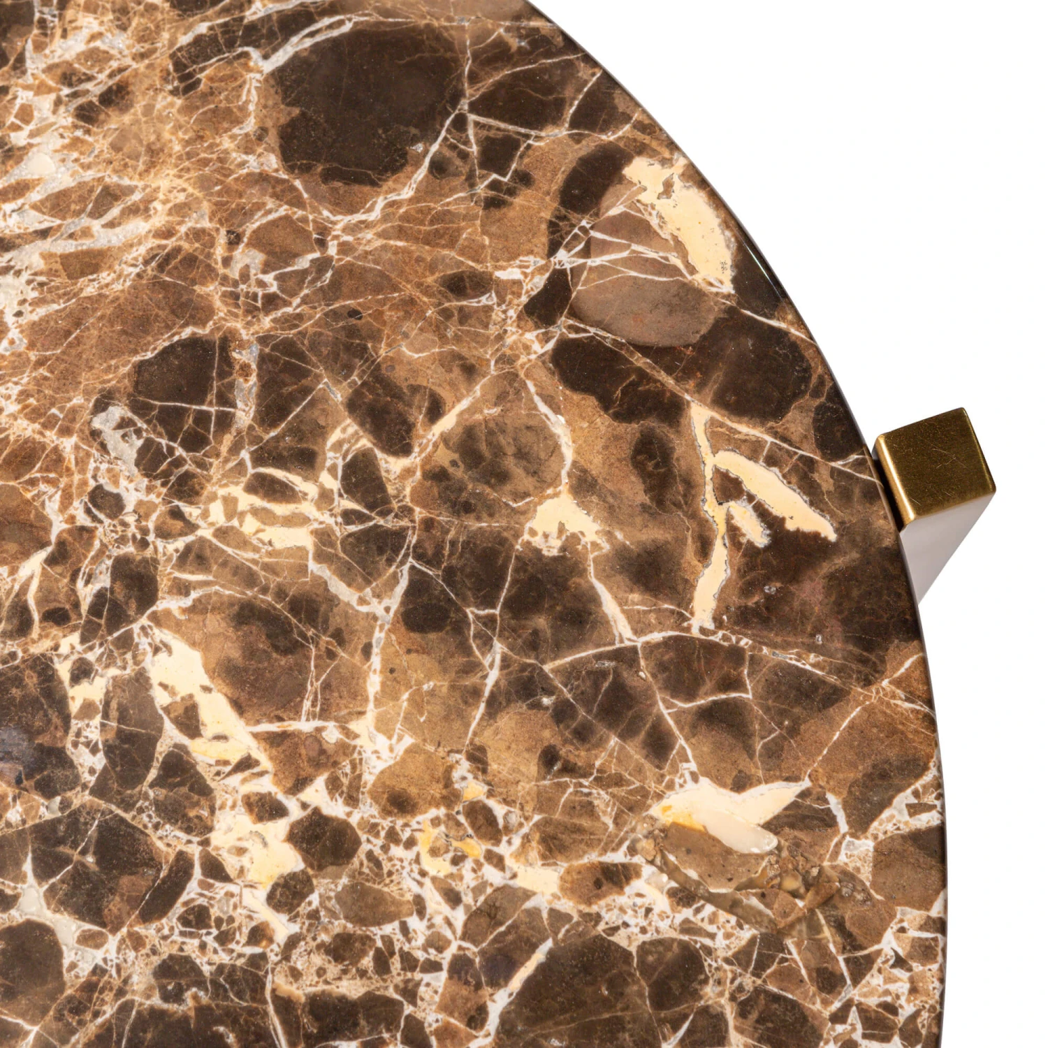 An antique style circular coffee table brushed brass base with a crossover detail and topped with a slab of dark marble for a luxurious addition to your living space, creating a beautiful centrepiece to display books, accessories or as a surface for drinks.