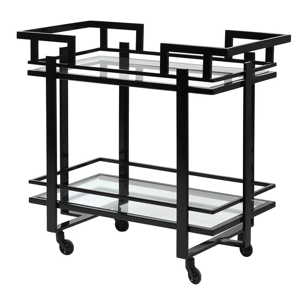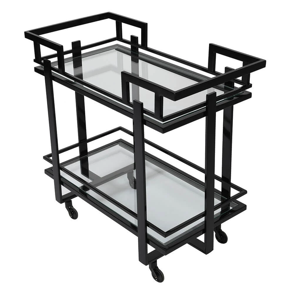 Display your drinks in style with this elegant black drinks trolley, crafted with two glass shelves to make your favourite glassware pop. Designed with 4 wheels and subtle sides for practicality while looking great.