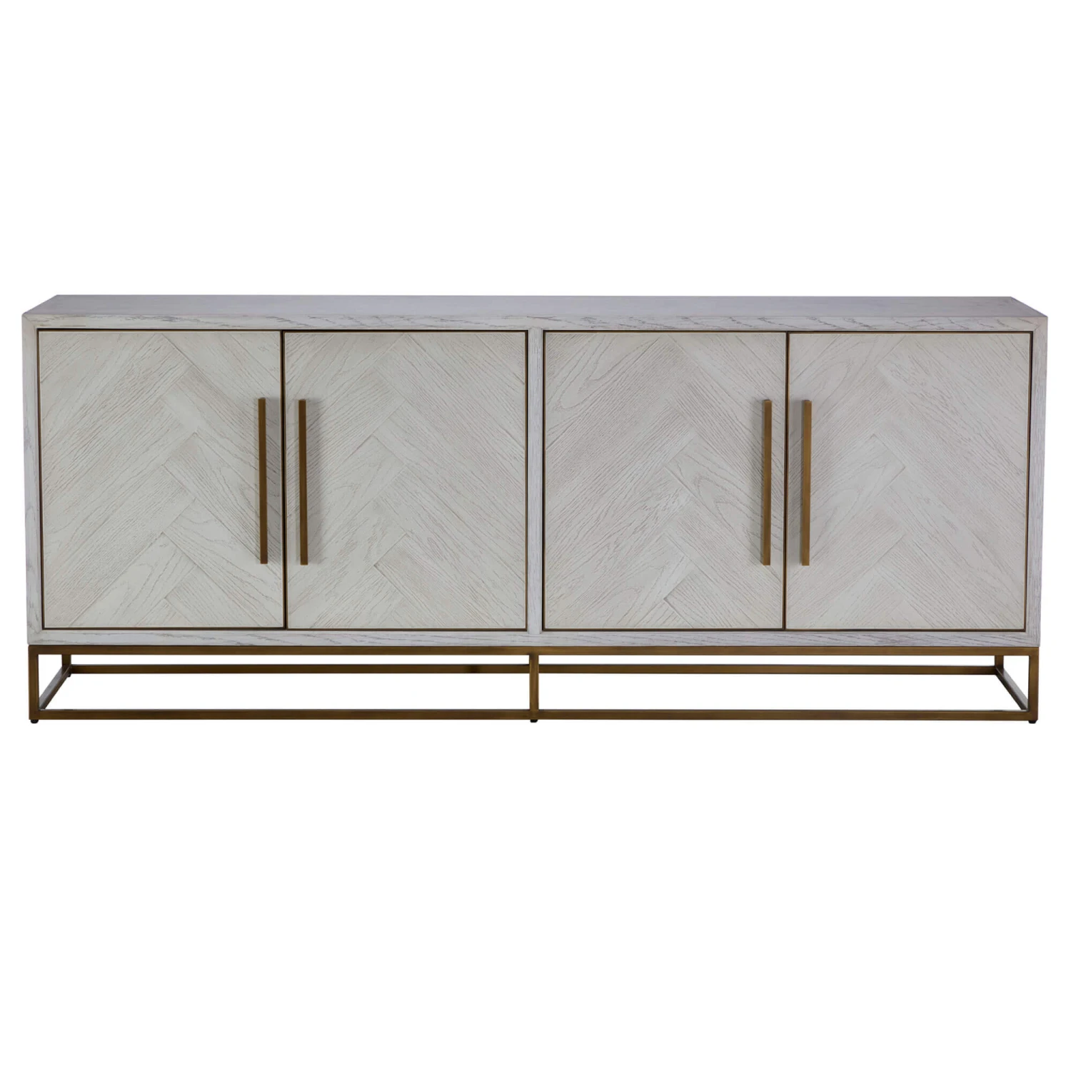 The Santa Monica White Wood Sideboard has a charming coastal-inspired design, featuring four doors adorned with an intricate herringbone pattern running down their center. Finished with an oak veneer and a white coating that evokes the sun-bleached driftwood of coastal shores. The exterior wooden frame, slightly protruding from the rest of the unit, showcases meticulous craftsmanship with its precise mitered edge and inner bevel, creating a gradual, smooth connection to the side panels that catches the light beautifully.