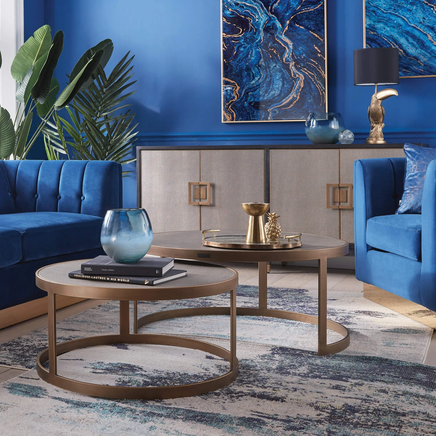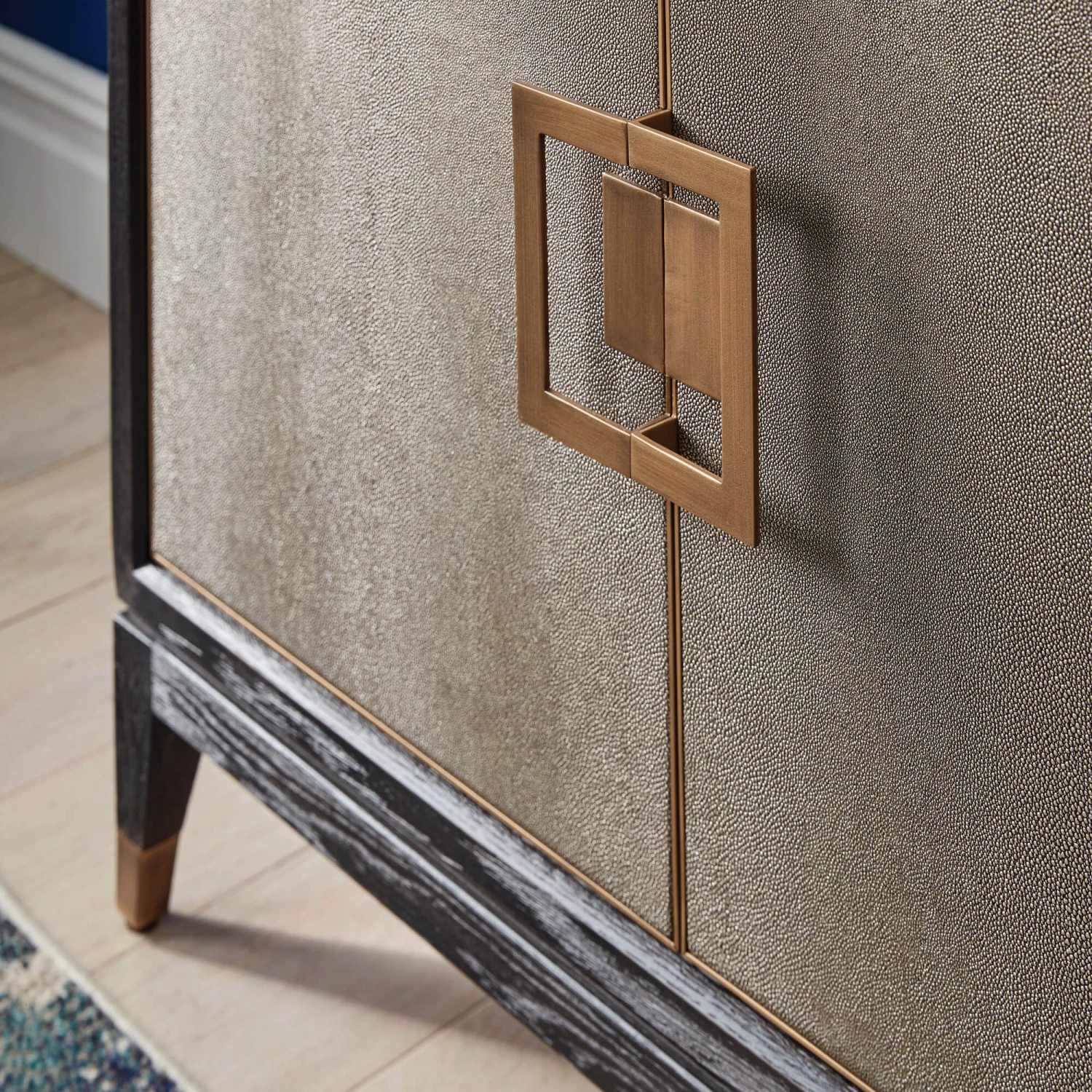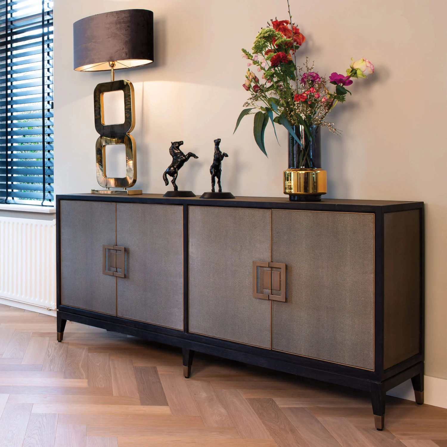 Designed for those who love to entertain, the Stellar 4 Door Grey Shagreen Sideboard is perfect for bringing the indulgent, free spirit of the roaring 20s to your home. With its decadent matte gold trims and ferrules, statement geometric handles and grey shagreen look fabric that graces the sides and doors, the Stellar boasts a classic, art deco inspired design.