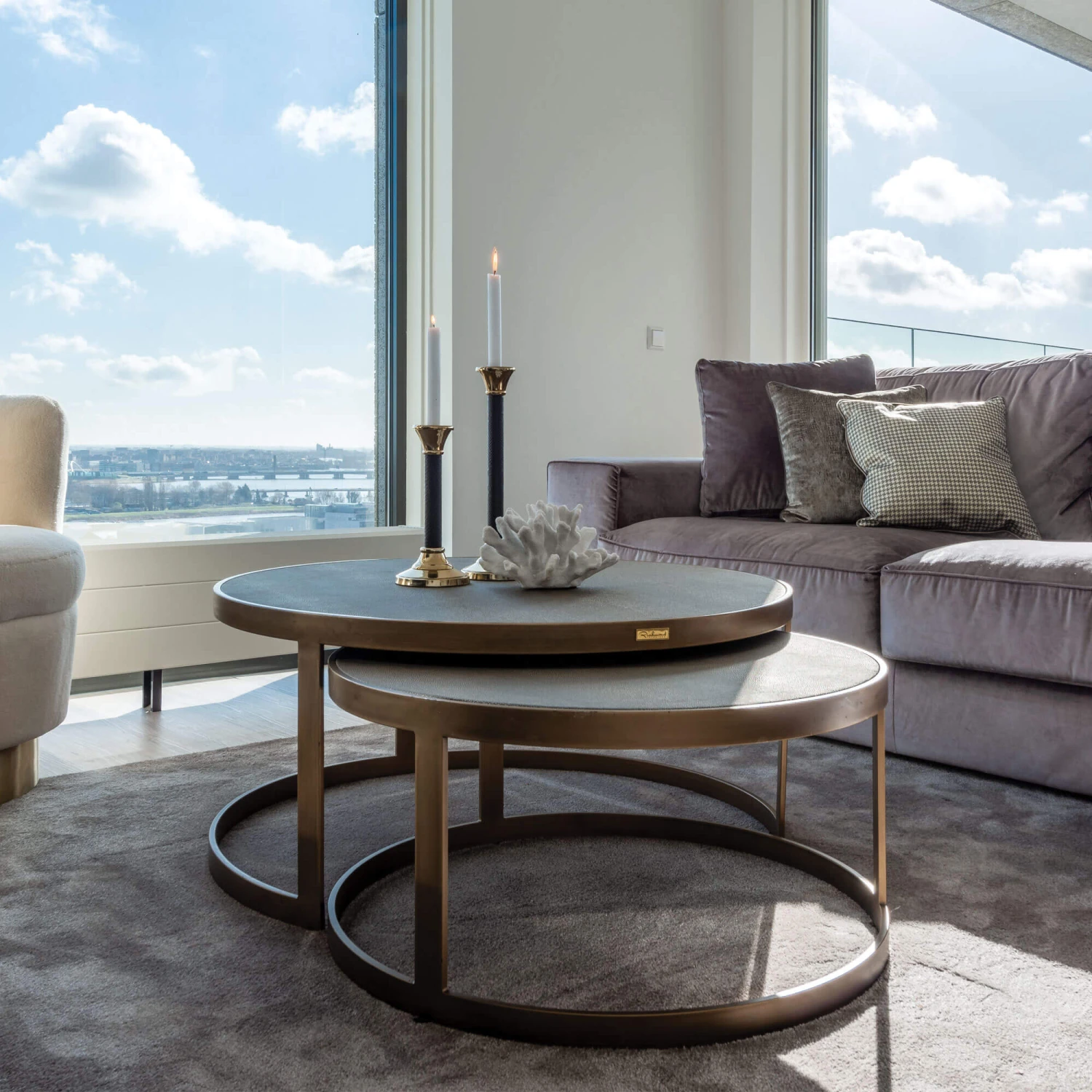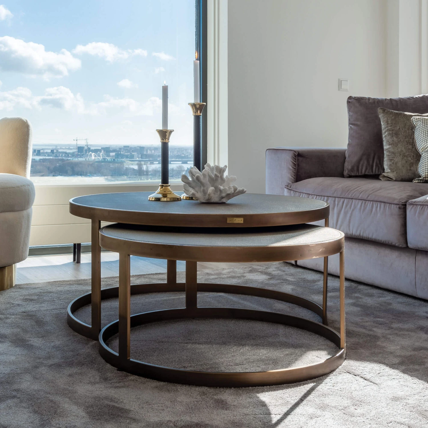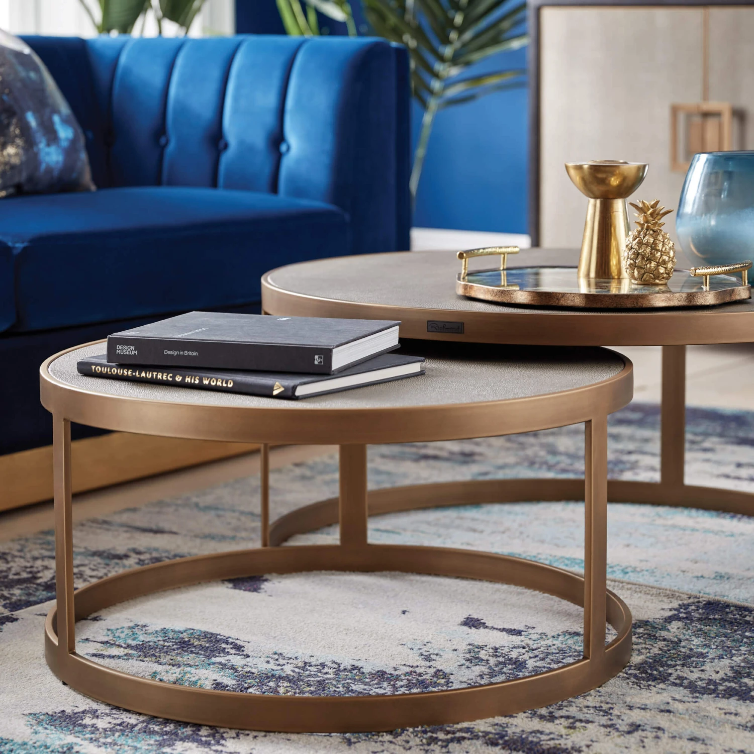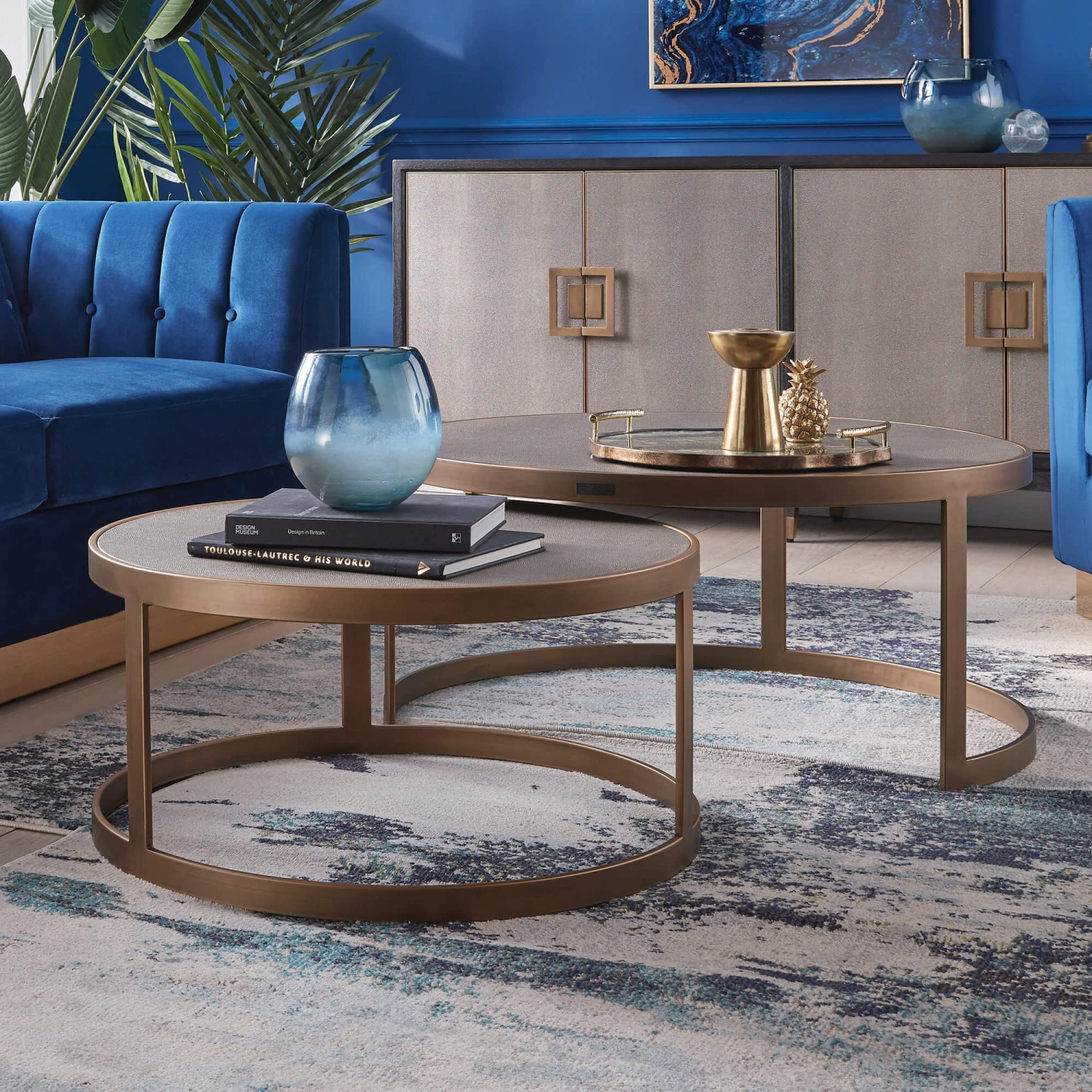 Designed for those who love to make a stylish statement, the Stellar Set Of 2 Grey Shagreen antique gold frames in a matte finish coffee tables is perfect for bringing the indulgent, free spirit of the roaring 20s to your home. With its decadent antique gold frames and grey shagreen look fabric that graces the tops of the tables, the Stellar boasts a classic, art deco inspired design. The matte finish of the frames contrasts the textured appearance of the table tops beautifully, lending the Stellar Coffee Table Set a truly opulent design which is sure to make a striking centre-piece in any living area, whilst bringing an element of refinement to its surroundings.