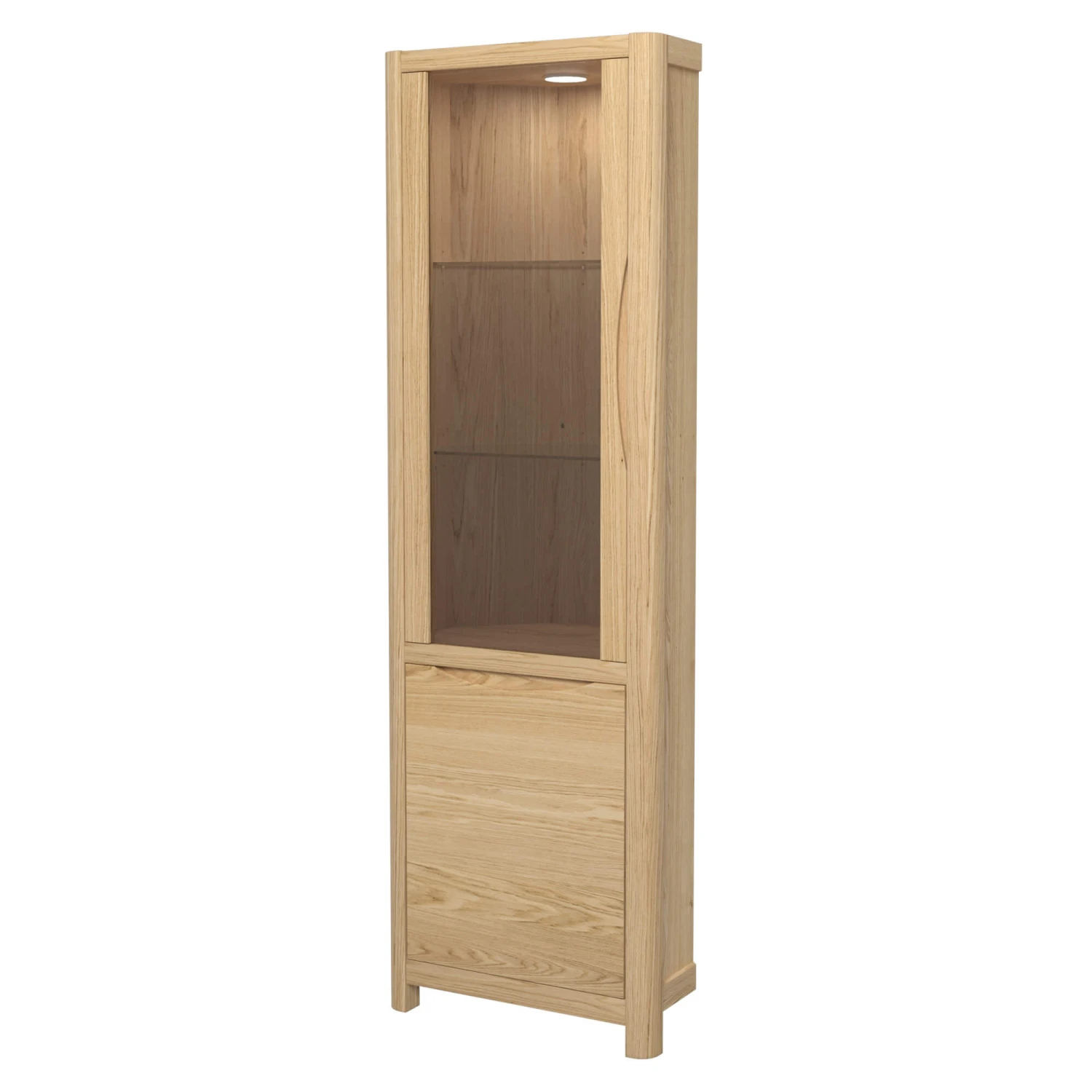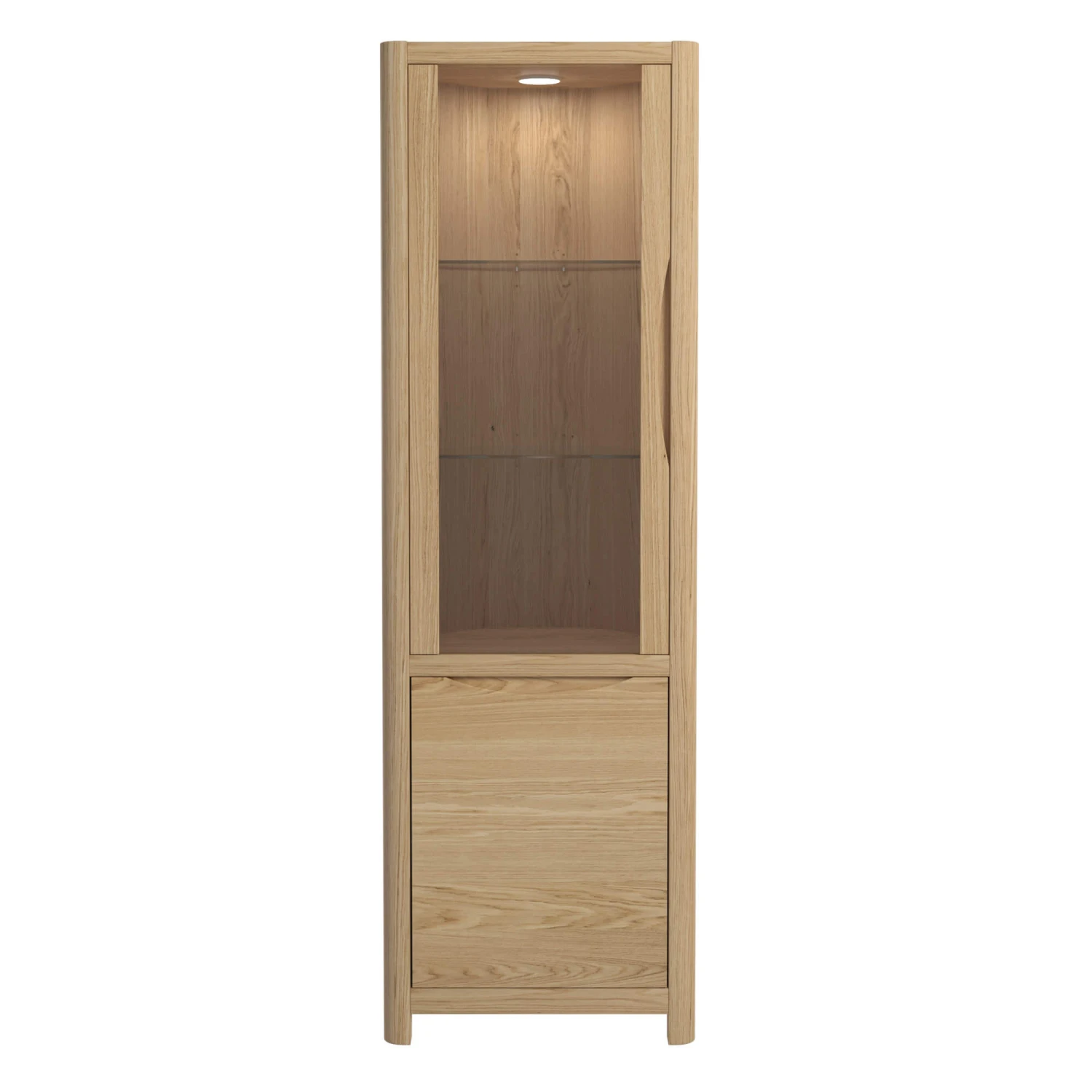 The Stockholm Display Cabinet is the ideal size for apartment living and is perfect for sprucing up any cosy corner in your lounge, dining or living area, with its compact, space-saving design. Offering both storage and display space for your favourite ornaments and decorative pieces, this display cabinet was designed with form and function in mind. Its 2 glass shelves create 3 adequately sized display compartments, whilst the 1 door cupboard provides a convenient, hidden storage solution. Accompanied with its elliptical shaped, recessed handles and built-in spotlight, which helps to showcase your display pieces in the best light, this narrow corner display cabinet is a practical piece, suitable for small homes.