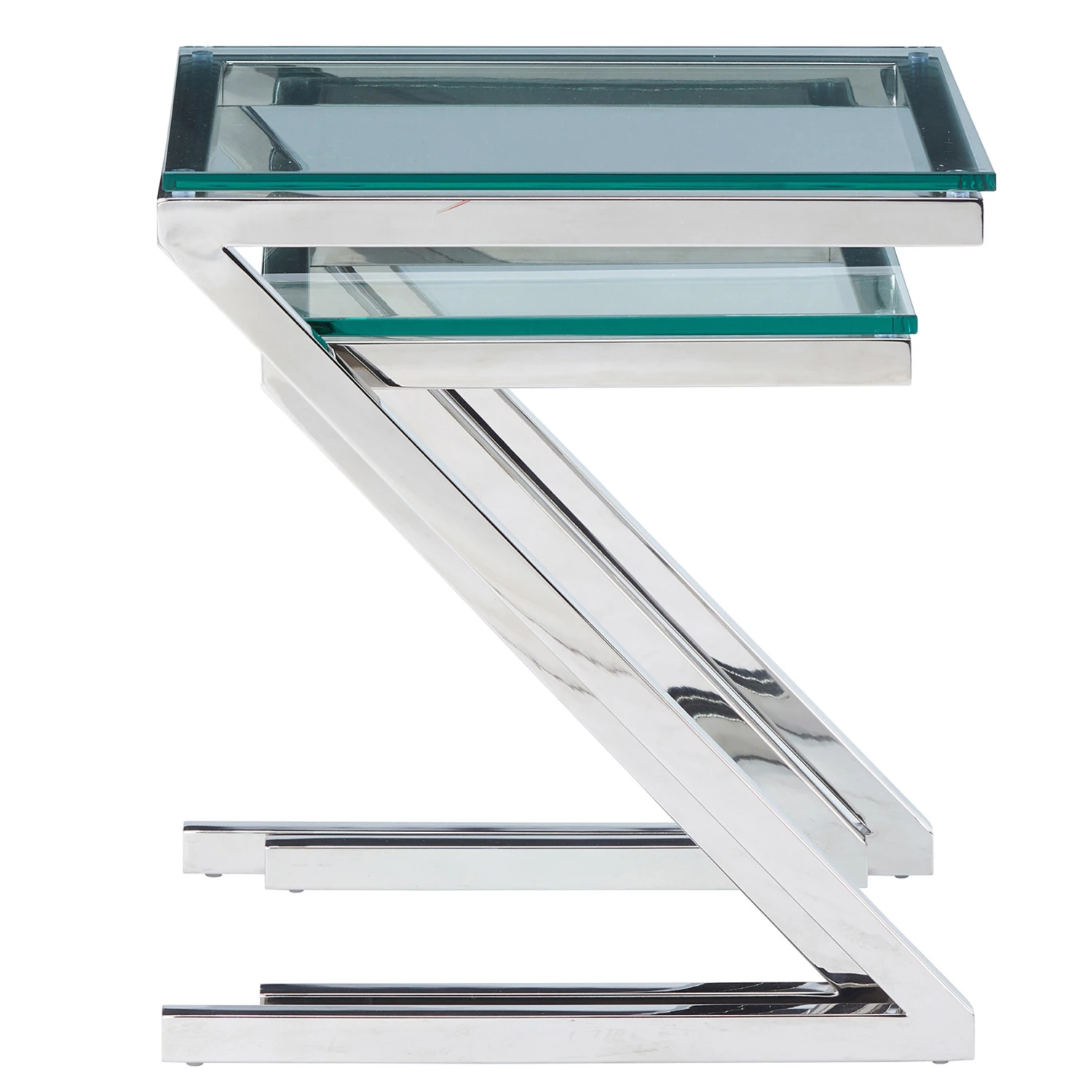 The stunning storm glass set of 2 tables features a clear glass top, supported by a striking, architectural polished stainless steel base with strong, clean lines. The glass top allows light to flow through the table, creating the illusion of taking up less space in the room. Adding another statement to his design is its distinctive Z-shaped figure, resulting in a more streamlined look, but maintaining a solid structure. Simply nest them together or slide on either side of your sofa, chair or even your bed to add a touch of drama to any ensemble.
