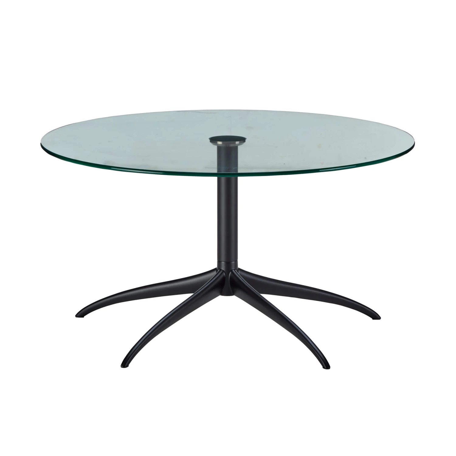 A large round side table featuring a black metal base that has 4 softly arching legs that taper towards the bottom. On the top sits a rounded soft glass table top that promotes a light and airy feel in your space.