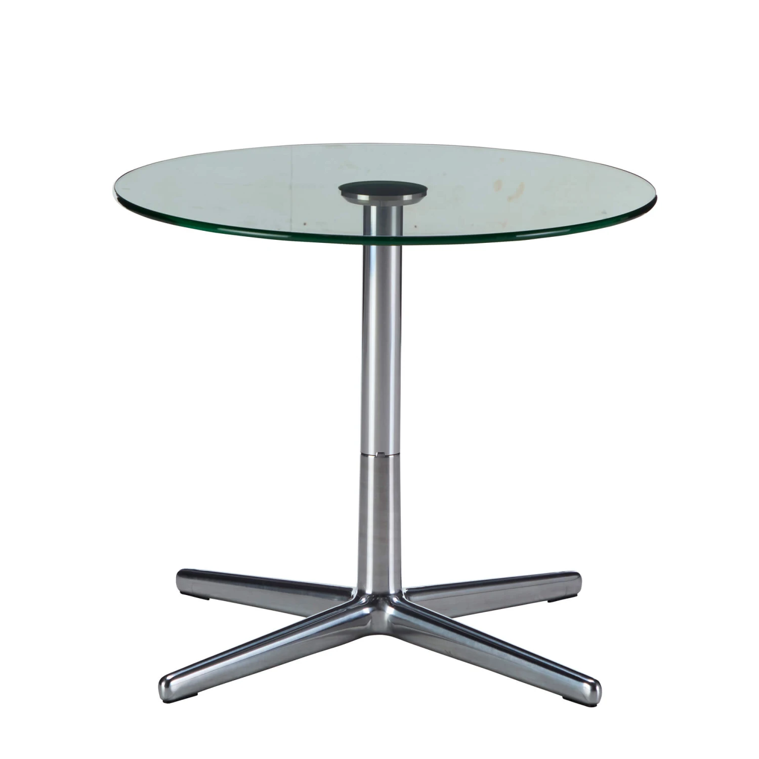 A short round side table featuring a polished chrome base that has 4 slender legs that form a cross shaped base. On the top sits a rounded soft glass table top that promotes a light and airy feel in your space.