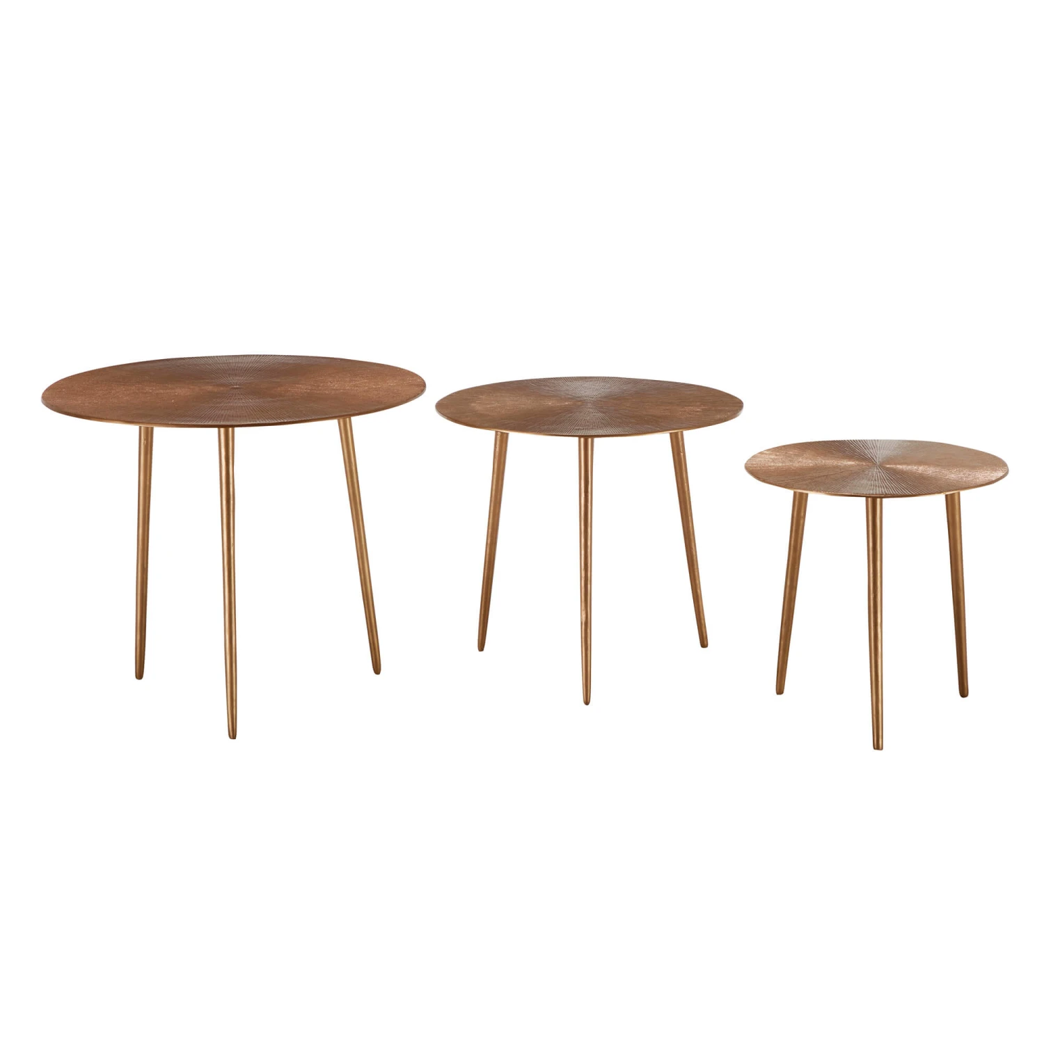 The Tangiers nest of 3 tables are crafted with coated aluminium in a brass antique finish. Designed with 3 minimalist legs for a sleek finish that will compliment your home perfectly, display together for plenty of surface space to create a beautiful focal point in your living space or spread across your room where required.