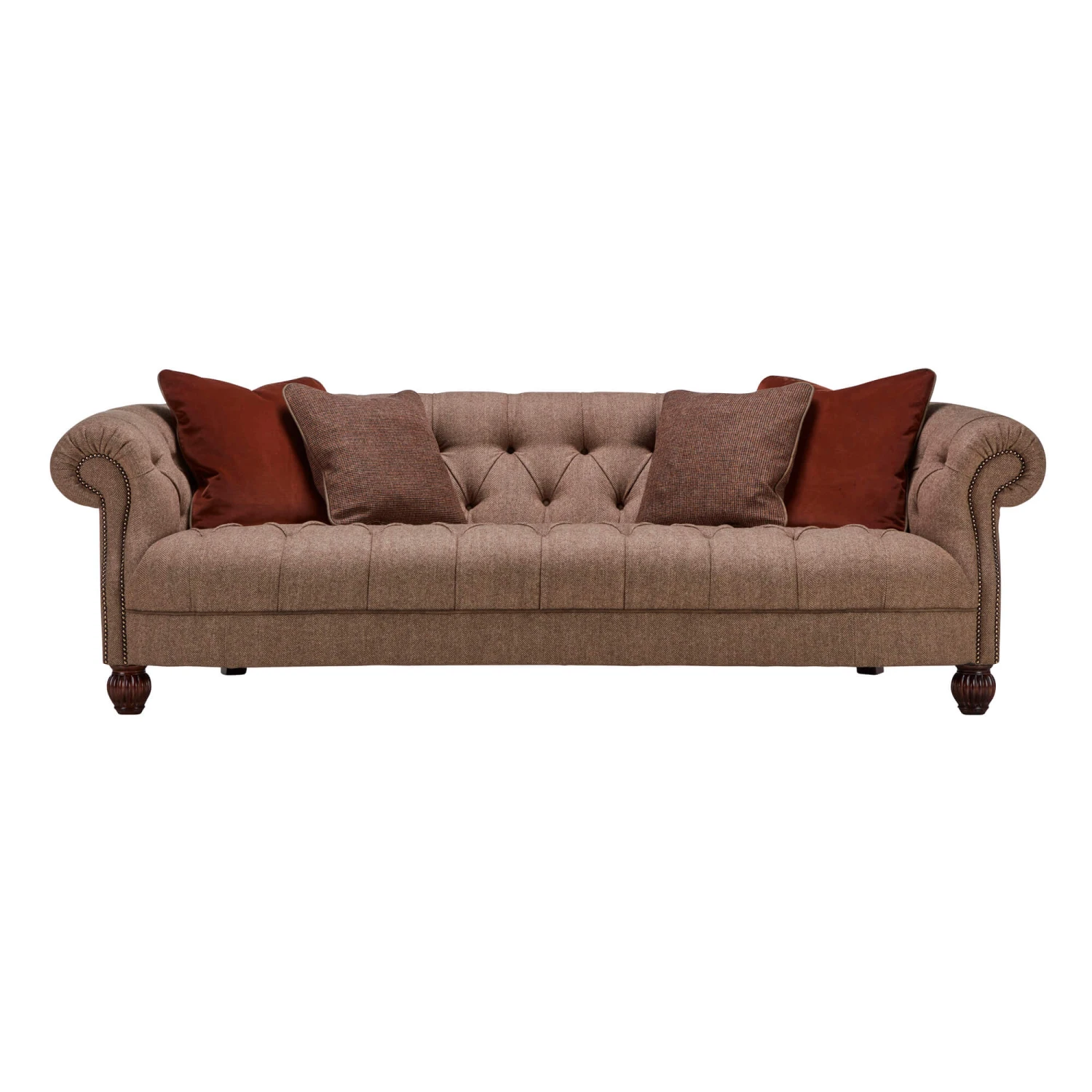 Uniting enduring design and exceptional comfort, the Tetrad Caledonian Brown Tweed Herringbone Fabric Midi Sofa will add a sophisticated statement to any living space. Upholstered in a luxurious brown tweed fabric, woven in a captivating chevron pattern, the Caledonian Sofa offers a stylish take on a timeless classic. Deep valueed detailing, plush fillings and intricate chunky round wooden feet elevate this sofa into a statement piece that commands attention, whilst rows of polished studs along the arms and base add a touch of tradition and complement the rich tones of the tweed fabric. Two luxurious feather-filled scatter cushions in a complementing fabric complete the look.