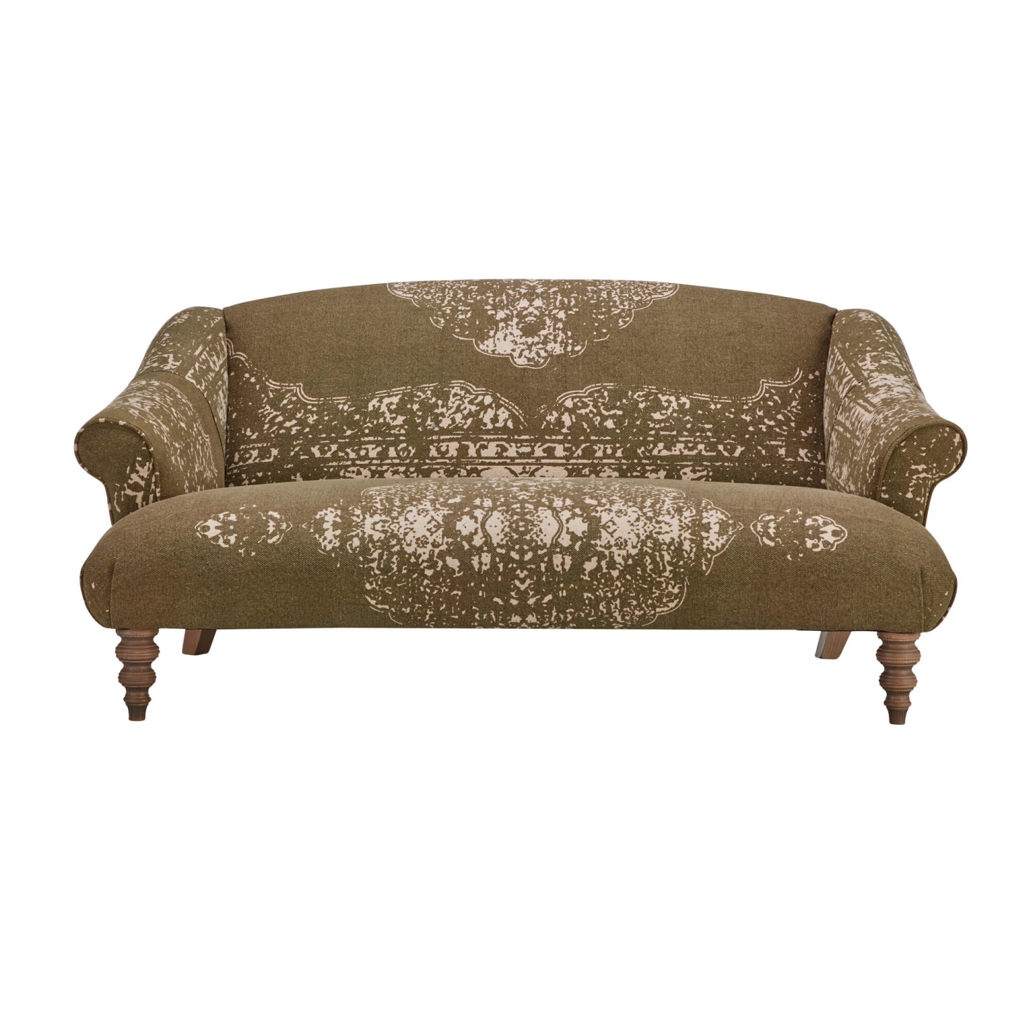 Stylish turned wooden legs in a driftwood finish elevate the sofa and add a touch of organic warmth, creating a beautiful contrast with the khaki green fabric. With its distinctive upholstery and timeless silhouette, this remarkable sofa offers a perfect blend of authentic charm, exceptional comfort and high-quality materials, making it a cherished centrepiece for any living space.