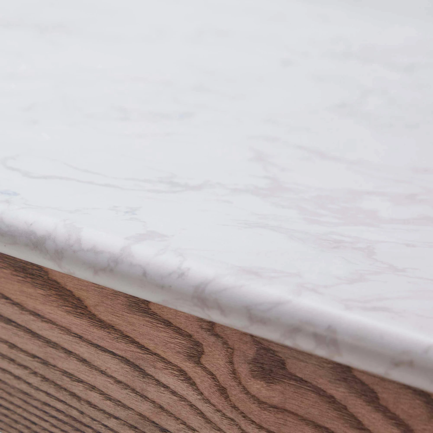 A contemporary 200cm oak dining table that features large, solid legs that intersect the smooth marble table top. On each of the legs is a subtle half bevelled edge which compliments the rounded surface edge. Throughout there is a distinct wooden grain that is showcased, contrasting the soft white marble top.