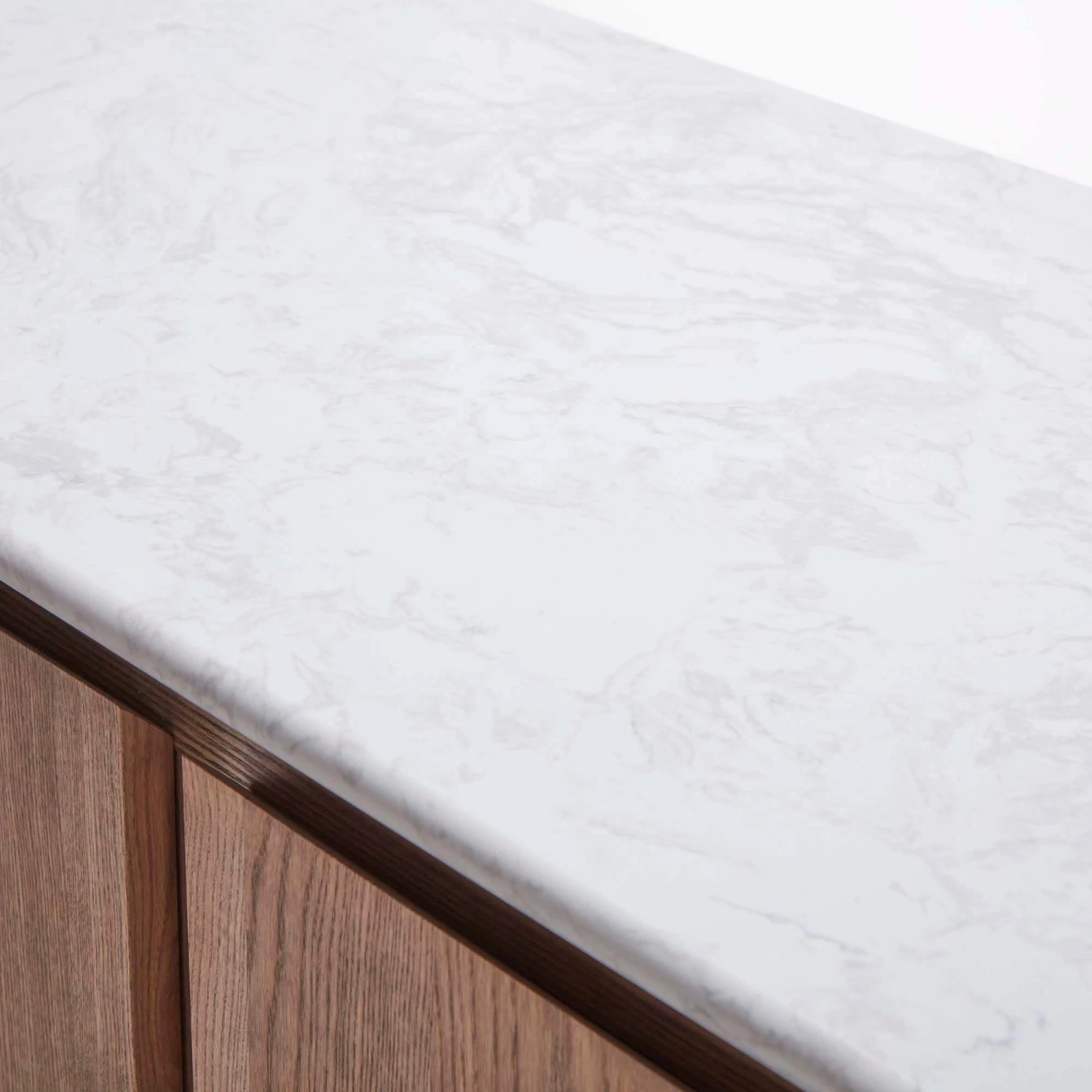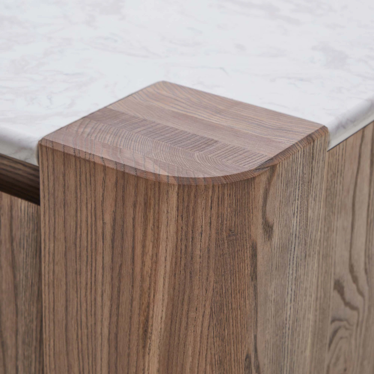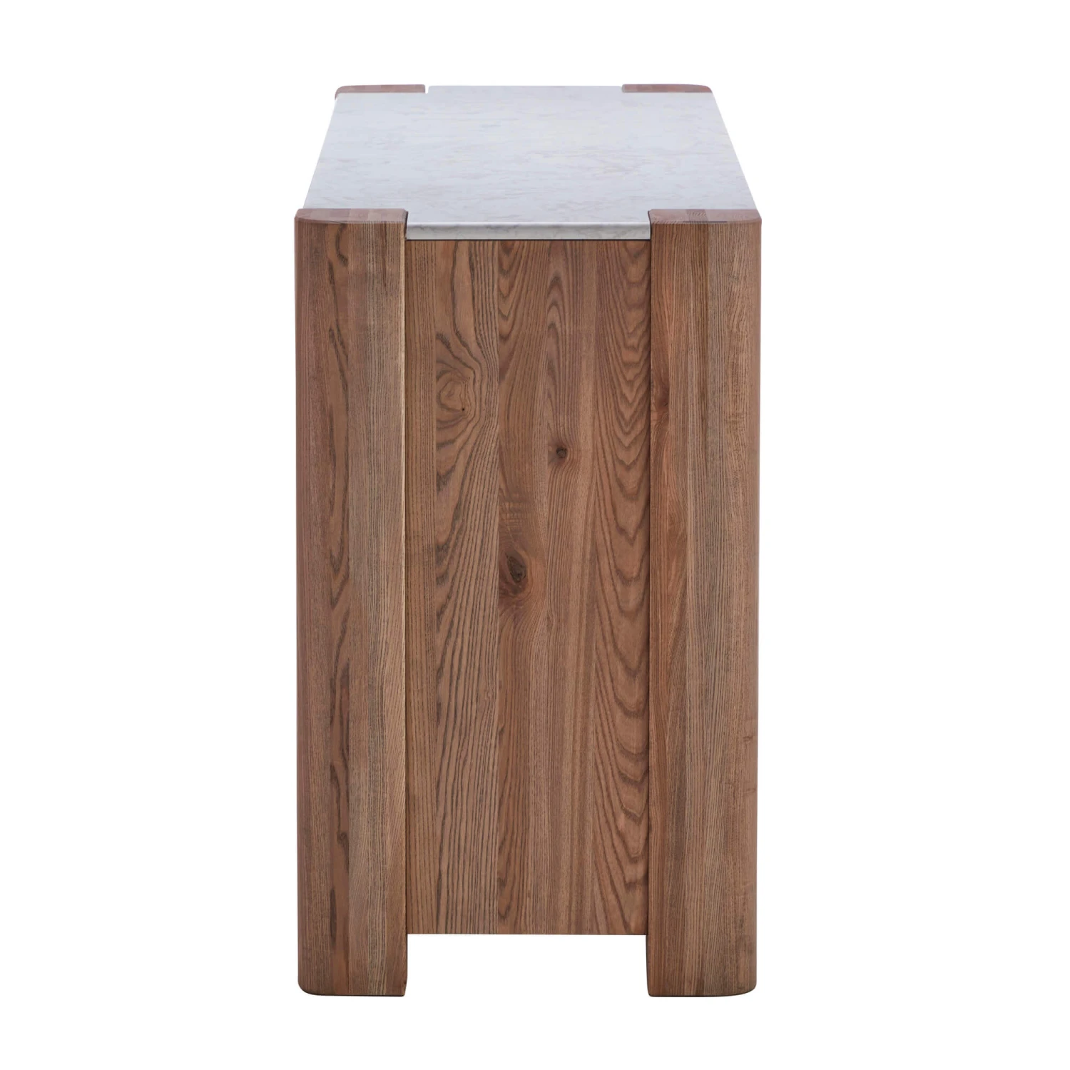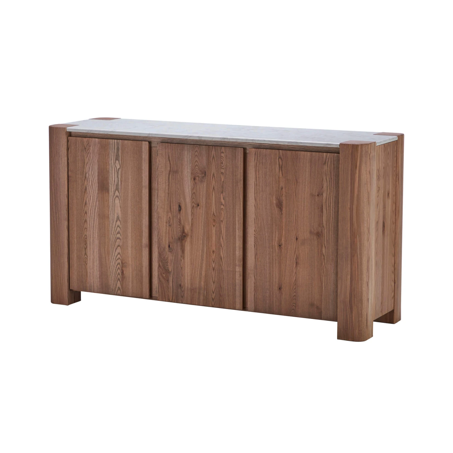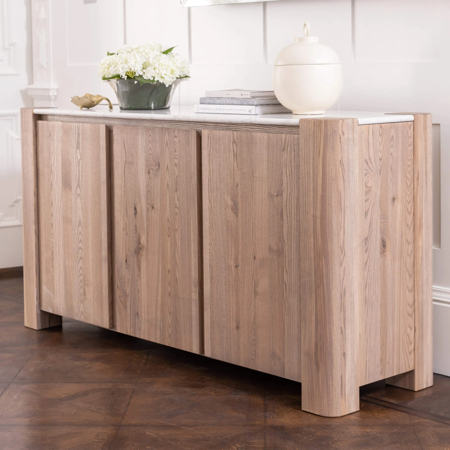A contemporary oak sideboard that features large, solid legs that intersect the smooth table top. On each of the legs they have a subtle half bevelled edge which compliments the rounded surface edge. Throughout there is a distinct wooden grain that is showcased, contrasting the soft white marble top. There are three large doors at the front of the unit that open to a large spacious shelf allowing you to store all your accessories.
