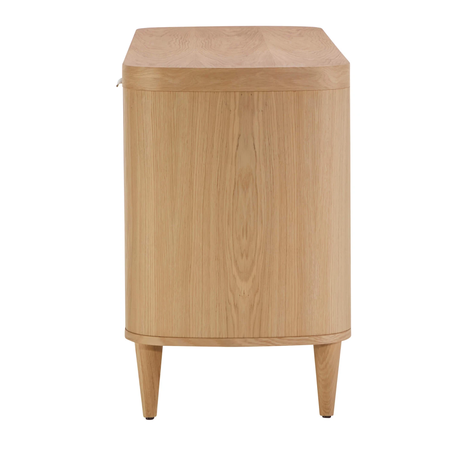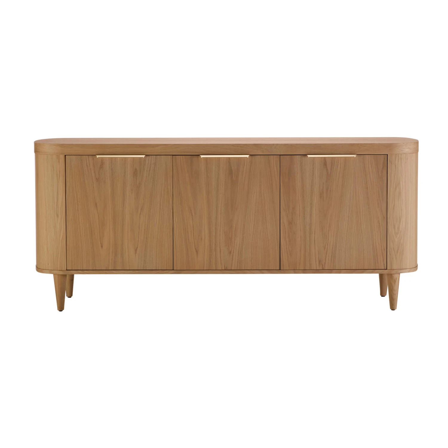 A spacious 180cm sideboard in a wonderful soft oak finish. The unit features three large doors, each paired with a light bronze coloured finger pull handle, allowing to easy opening and closing. On the base are 4 tapered cone shaped legs that are in a matching light oak finish. Both the top and base of the unit is mirrored, each featuring soft rounded edges creating an oval shape.