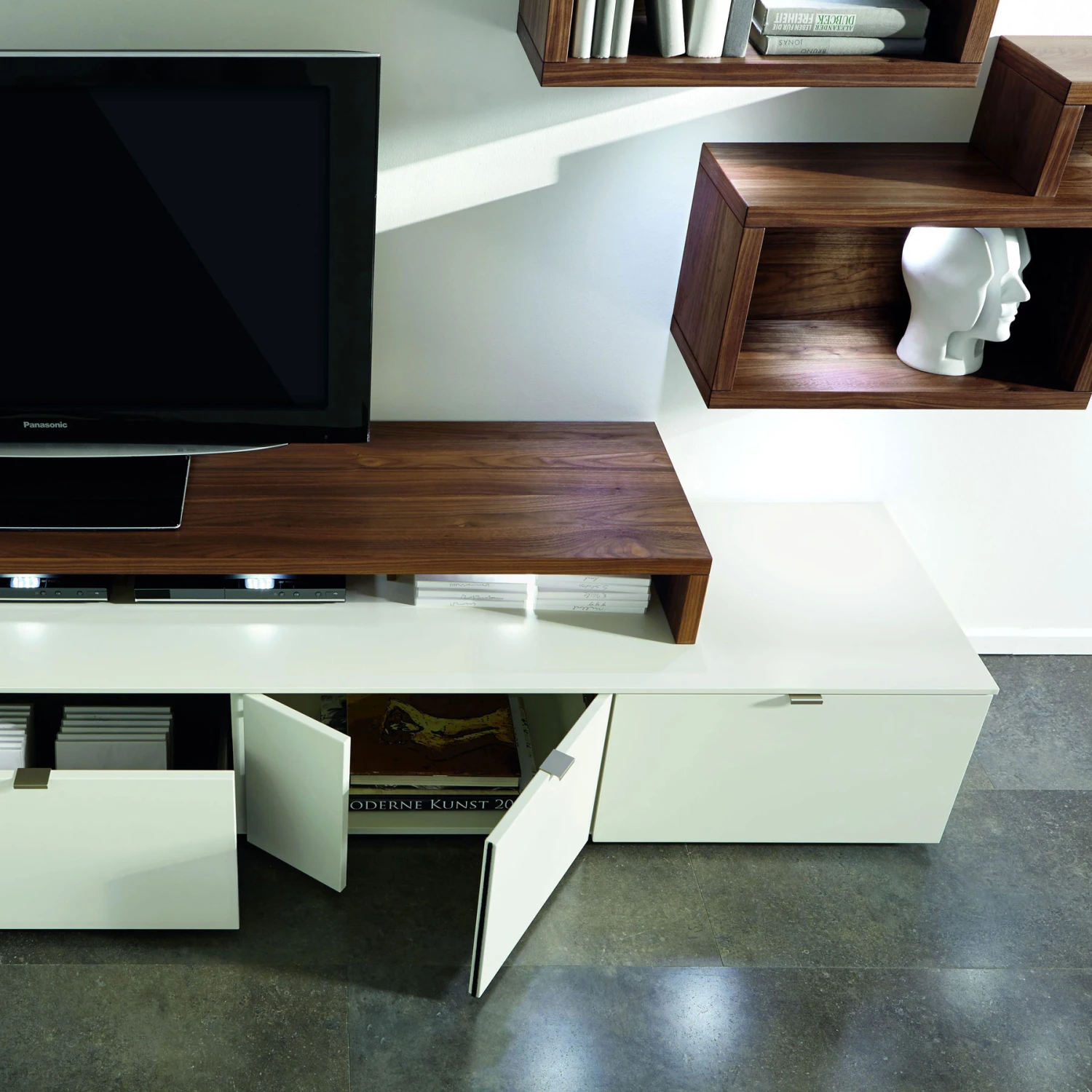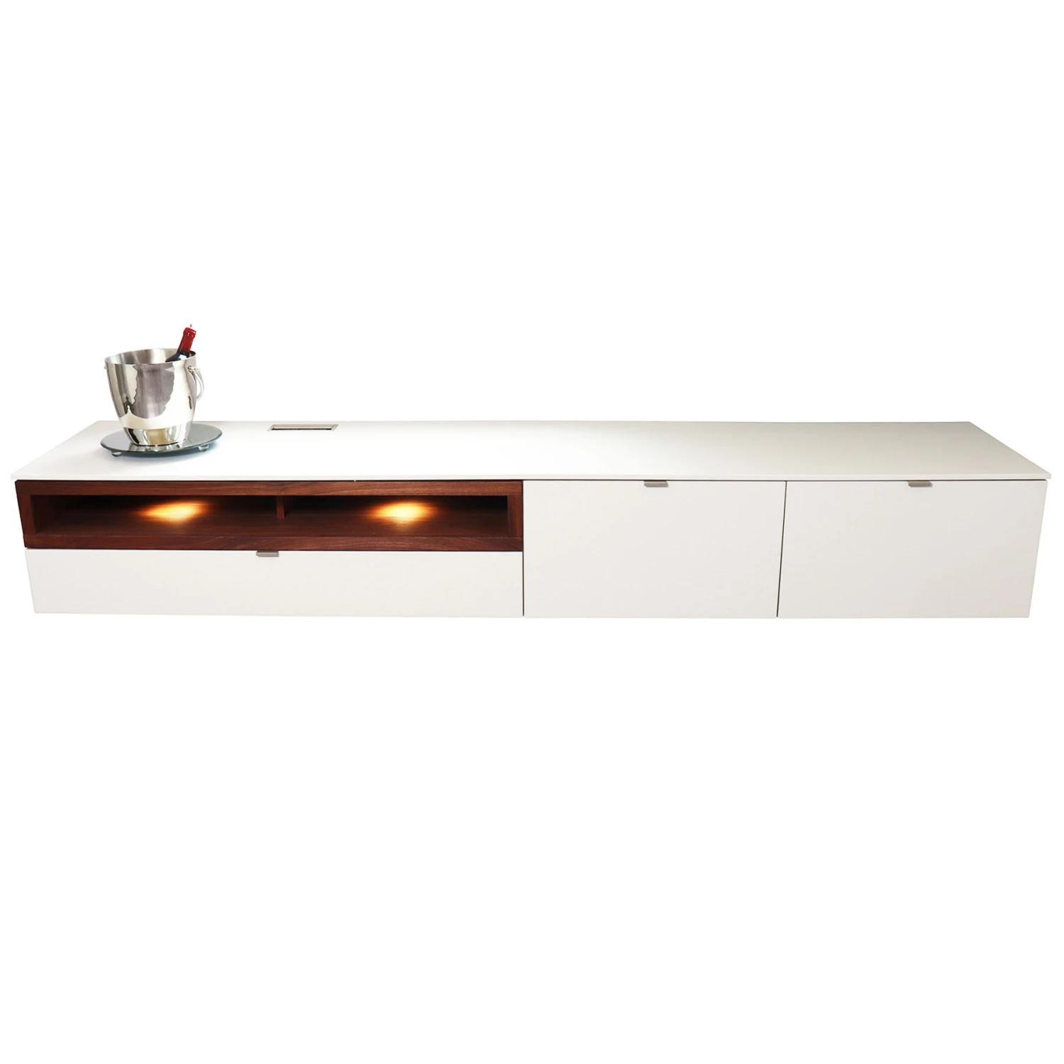 The Andiamo TV Lowboard is beautifully finished in a contemporary White Lacquer with contrasting Colorado Walnut accents. The unit features an inset open shelf for you to display decorative pieces, illuminated by LED lighting, whilst the large pull out drawers provide plenty of storage for books, magazines, DVD’s or consoles. The top of the lowboard also has a convenient cable flap for ease of use