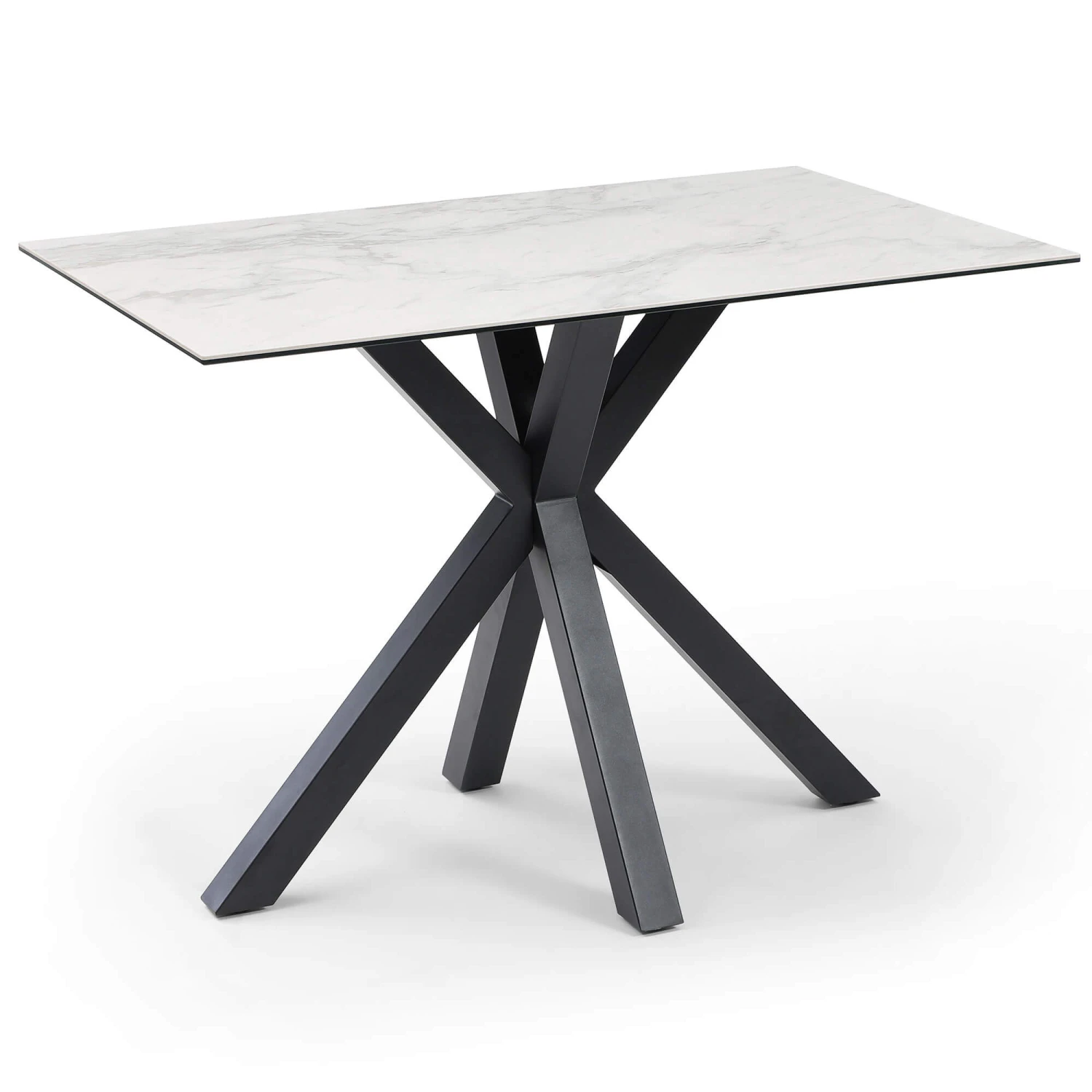 A simplistic yet contemporary bar table with 4 black steel legs in a starburst shape that provides the table with a modern touch whilst remaining sturdy. The table top surface has two layers, with the underside being a black aluminium that firmly connects to the legs whilst on top is a layer of ceramic with a wonderful grey marble effect that runs throughout. The tables height is ideal for a range of stools and helps elevate any modern space.